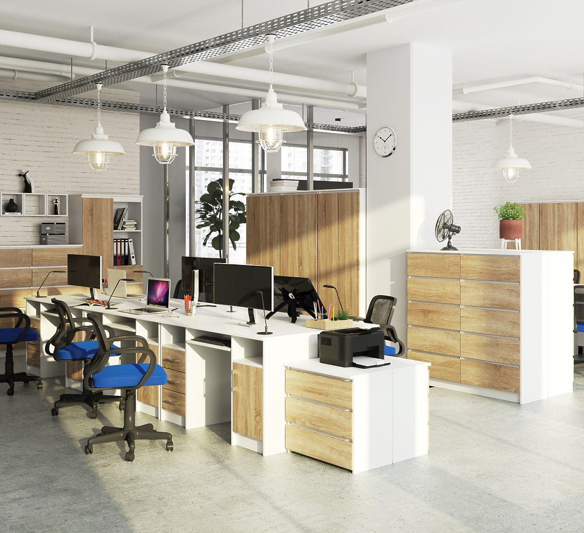 Le bureau ANA a été conçu en pensant aux bureaux et aux espaces de travail. Bien sûr, il convient également très bien comme bureau d'étudiant. La combinaison de couleurs classique blanc et sonoma permet une adaptation facile à tout intérieur. La grande surface du plateau nous permet de placer le moniteur où nous le souhaitons. Le clavier peut être placé sur l'étagère coulissante sous le plateau. Le bureau offre une grande quantité d'espace de rangement, des étagères ouvertes, des tiroirs et une armoire avec une étagère. Toute la structure est fabriquée en panneau stratifié résistant à l'usure.