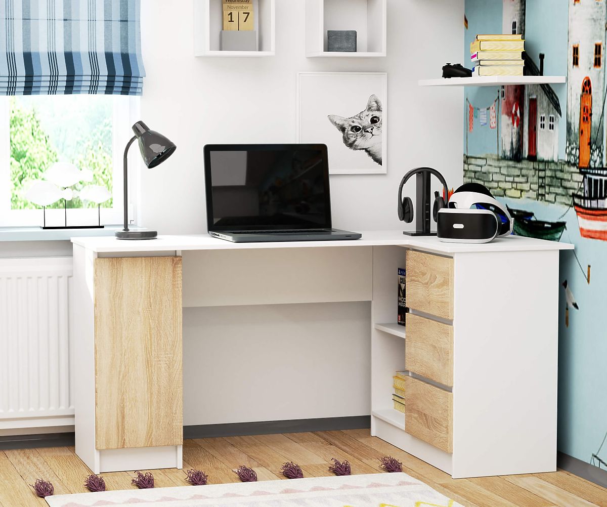 Les bureaux informatiques sont un type de mobilier sans lequel beaucoup de gens ne peuvent imaginer leur appartement ou leur bureau. Récemment, les bureaux d'angle sont très populaires car ils offrent un confort maximal. Le bureau d'angle B20 avec une largeur de plateau de 155 cm est recommandé. C'est un meuble moderne de couleur blanche avec un ajout de couleur sonoma (façades de tiroirs et d'armoire). Le bureau offre beaucoup d'espace libre à utiliser. Le mobilier facilite l'utilisation de l'ordinateur, permet un travail et une étude efficaces. Il convient au salon et à la chambre des jeunes, ainsi qu'au bureau et à l'étude.