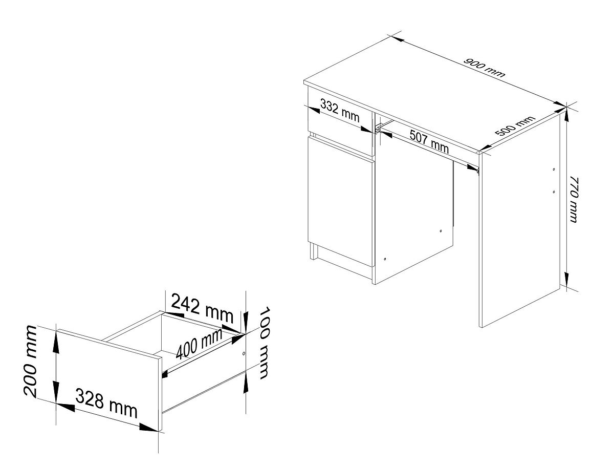 Le bureau d'ordinateur PIKSEL est fabriqué en panneau de meuble laminé en deux couleurs. Le corps, le plateau et le panneau arrière du meuble sont blancs, tandis que la façade du tiroir et du placard est gris graphite. Toutes les surfaces du meuble sont mates. La partie de travail se trouve sur le côté droit du bureau, où un tiroir coulissant pour clavier est fixé sous le plateau. Le côté gauche du meuble est entièrement fermé. Juste sous le plateau se trouve un tiroir, et en dessous - un placard fermé par des portes, équipé de deux étagères. Le tiroir et l'étagère pour clavier coulissent grâce à des rails métalliques.