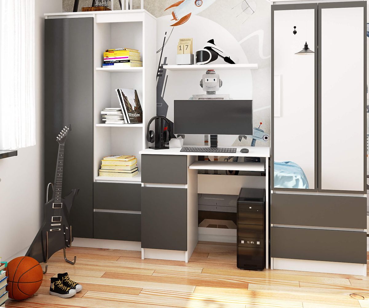 Le bureau d'ordinateur PIKSEL blanc/gris graphite est parfait pour une chambre d'enfant, d'étudiant, ou dans une chambre à coucher ou un salon où un coin est dédié au télétravail ou aux études. Il est également utile dans de petits espaces de bureau, où il s'harmonise parfaitement avec d'autres meubles sans poignées.