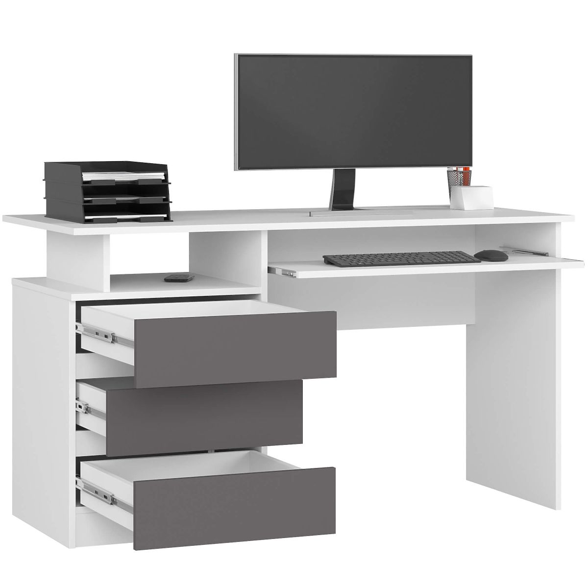Bureau blanc et gris avec tiroirs et étagère pour clavier. .. plus