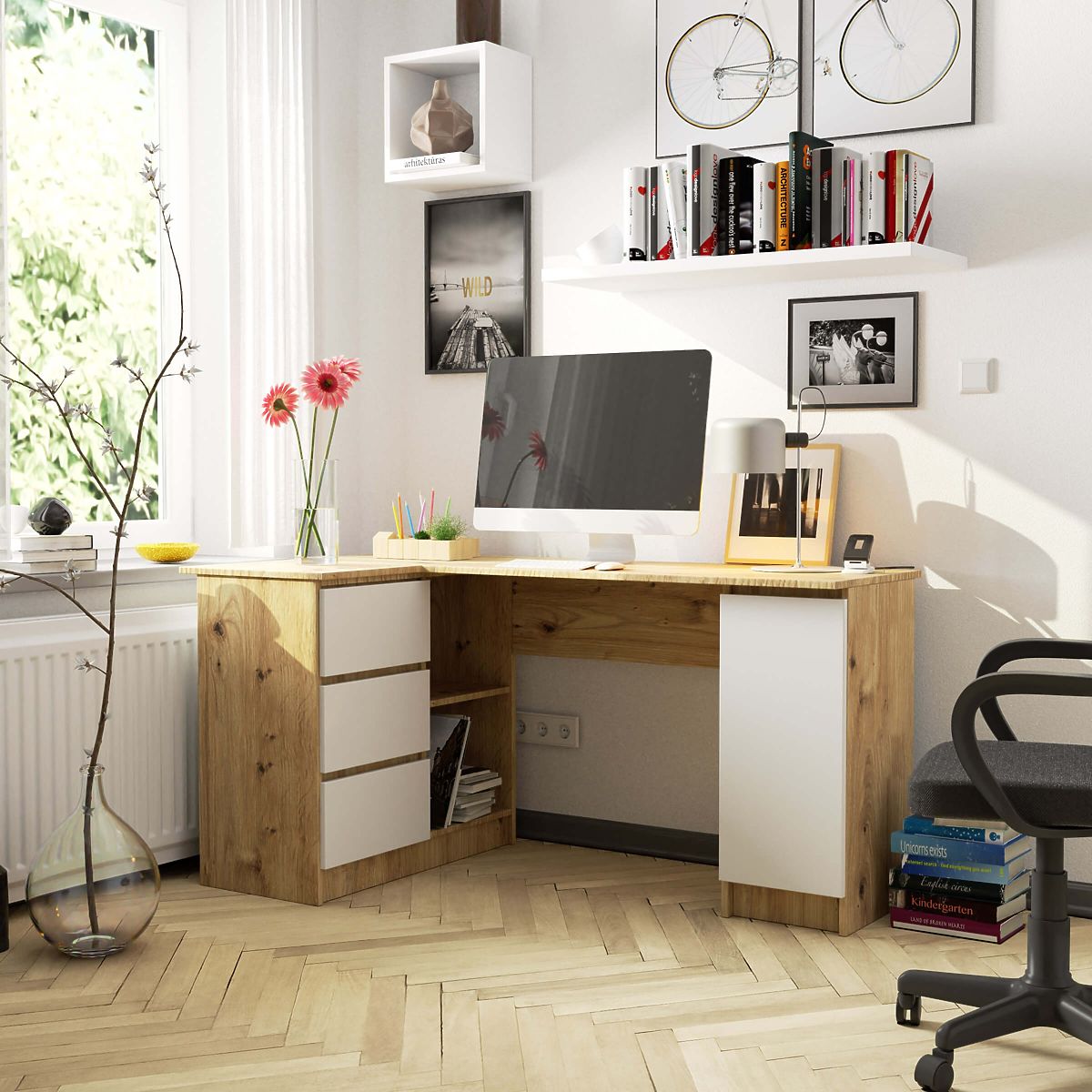 Le bureau d'angle B20 155 cm GAUCHE en couleur Chêne Artisan avec faces avant blanches est un meuble de bureau élégant au design moderne. Il sera un excellent choix pour les bureaux à domicile et les chambres d'enfants. Le bureau d'angle s'intègre dans l'agencement de la pièce et crée un espace approprié pour le travail et l'étude. Grâce aux tiroirs, étagères et armoire, situés de chaque côté du bureau, les objets nécessaires seront à portée de main. Nous pouvons également organiser facilement des documents, livres ou fournitures de bureau, qui peuvent être rangés dans les tiroirs spacieux se déplaçant sur des glissières à rouleaux. Le bureau est fabriqué en panneau laminé de 16 mm d'épaisseur de la marque Kronospan, résistant à l'abrasion, ce qui garantit une longue durée de vie du bureau. Les bords du meuble sont recouverts d'un chant ABS, assurant une résistance aux dommages mécaniques du bureau.