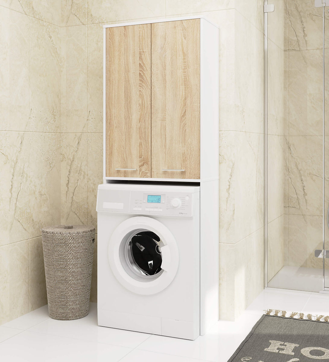 Si nous voulons que notre salle de bain soit aménagée de manière confortable et élégante, nous devrions nous concentrer sur des meubles solides et fonctionnels. Une telle armoire au-dessus de la machine à laver est certainement un bon choix. C'est une solution idéale pour utiliser l'espace au-dessus de la machine à laver, qui reste généralement inutilisé. Les dimensions optimales de cette colonne en font une excellente solution pour les petites salles de bain. Sa forme ergonomique permet son utilisation dans n'importe quelle pièce. Ce meuble, composé d'une extension au-dessus de la machine à laver et d'une armoire au-dessus, crée un grand espace de rangement pour divers objets. Nous pouvons y ranger des produits tels que des détergents ou des produits d'hygiène. Ces étagères sont destinées à ranger des cosmétiques personnels ou des serviettes. La belle teinte blanche avec des façades chêne sonoma nous garantit un aspect élégant de la salle de bain. Le panneau stratifié dont cette armoire est fabriquée est un matériau de haute qualité. Il assure la durabilité et la solidité du meuble ainsi que le maintien de son aspect esthétique.