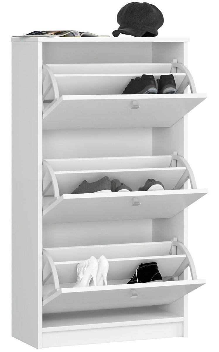 Meuble à chaussures blanc avec 3 portes abattantes, dimensions 60x113x28,5 cm. .. plus