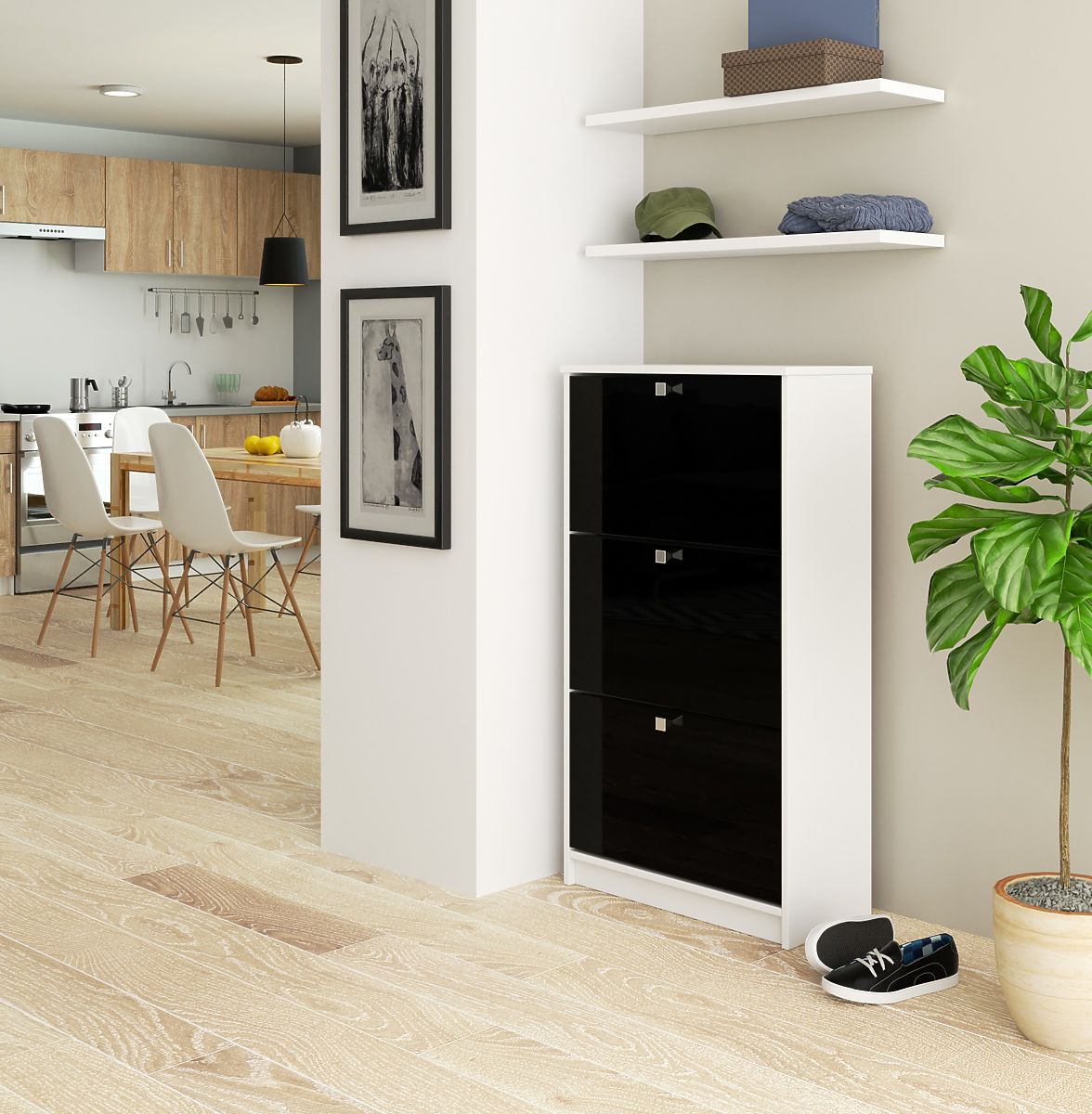 Meuble à chaussures moderne avec 3 portes abattantes, blanc et noir brillant. .. plus