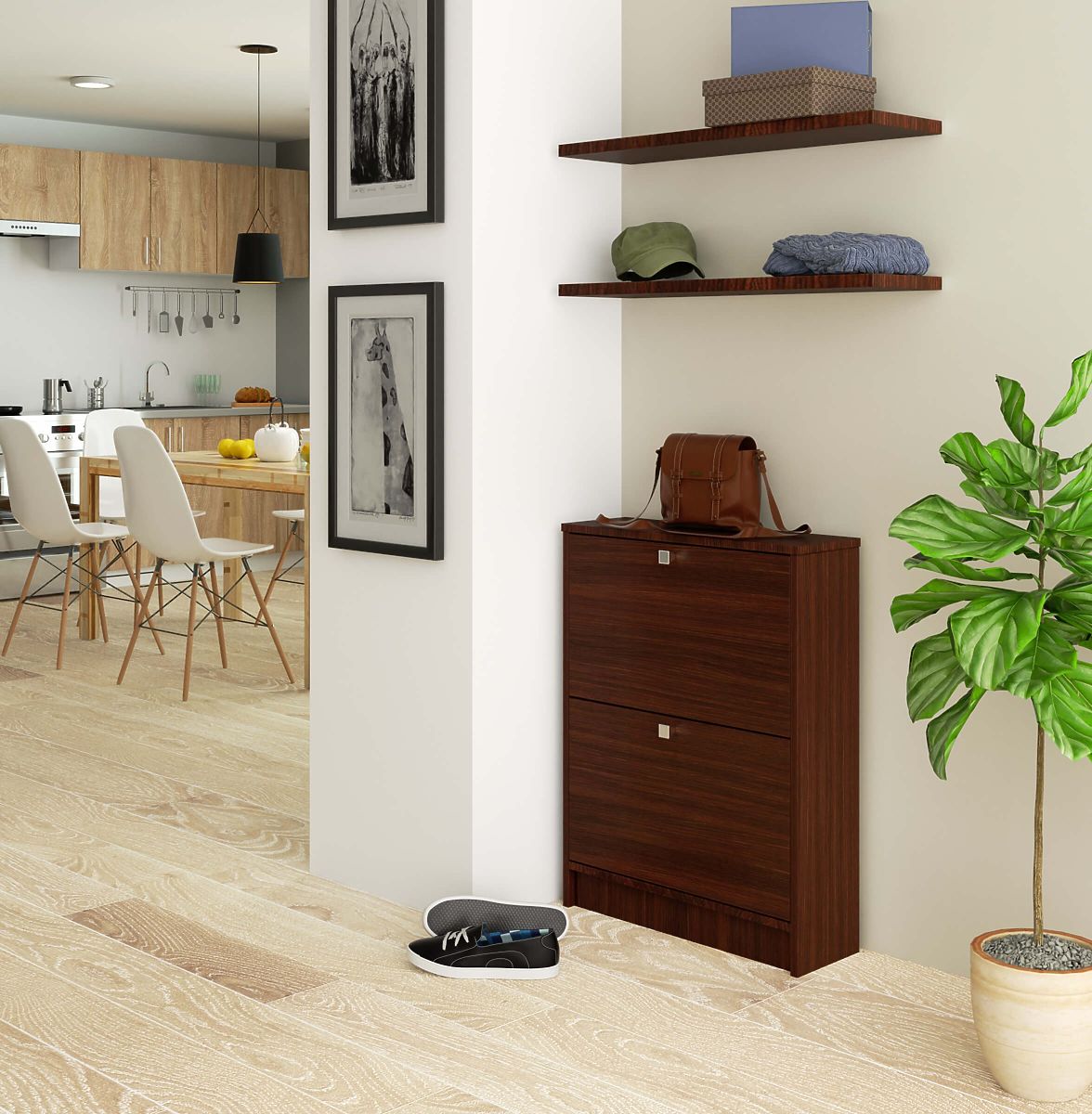 Le meuble à chaussures que nous avons l'honneur de présenter ressemble à une commode. Au lieu de placards ou de tiroirs, il est équipé de deux espaces de rangement pour chaussures qui peuvent facilement contenir plusieurs ou même des dizaines de paires de chaussures. Les tiroirs s'abaissent, ce qui permet un accès facile aux objets stockés. Les chaussures dans un tel meuble peuvent être rangées librement ou dans des boîtes. Le meuble est fabriqué en panneau stratifié durable, solide et résistant aux rayures dans la couleur wenge à la mode et demandée par les clients de notre boutique en ligne. Les poignées élégantes méritent également l'attention.