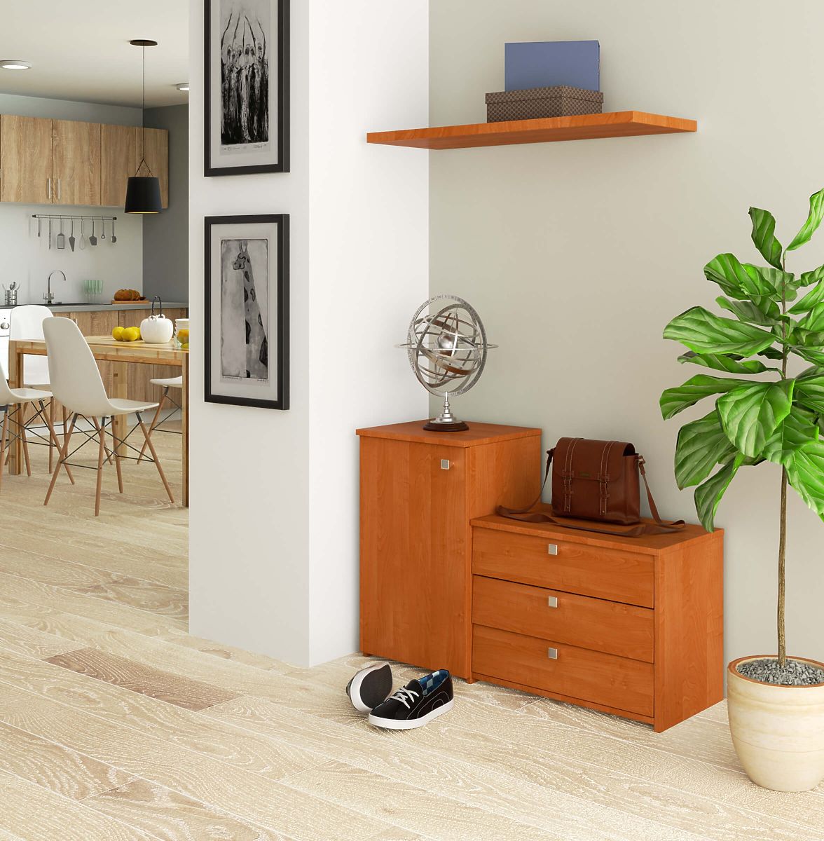 ENSEMBLE DE MEUBLES POUR ENTRÉE EN AULNE Le meuble à chaussures combiné avec une commode assure fonctionnalité et gain de place.