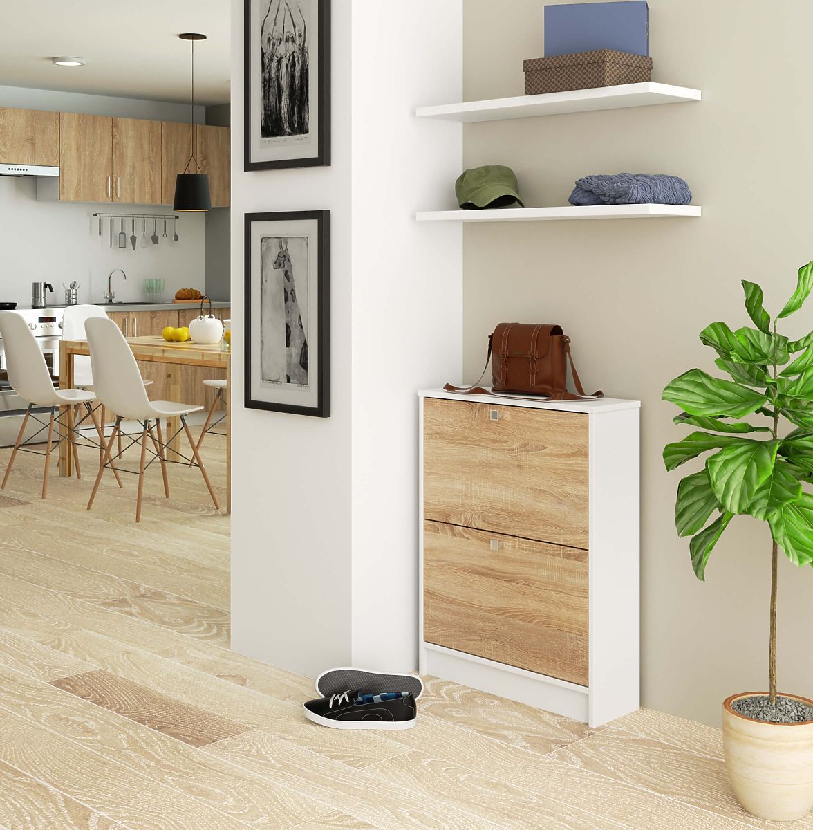 Meuble à chaussures avec portes abattantes et finition chêne Sonoma. .. plus