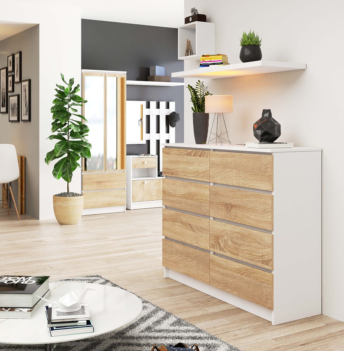 Commode en panneau laminé avec 8 tiroirs et chant ABS. .. plus