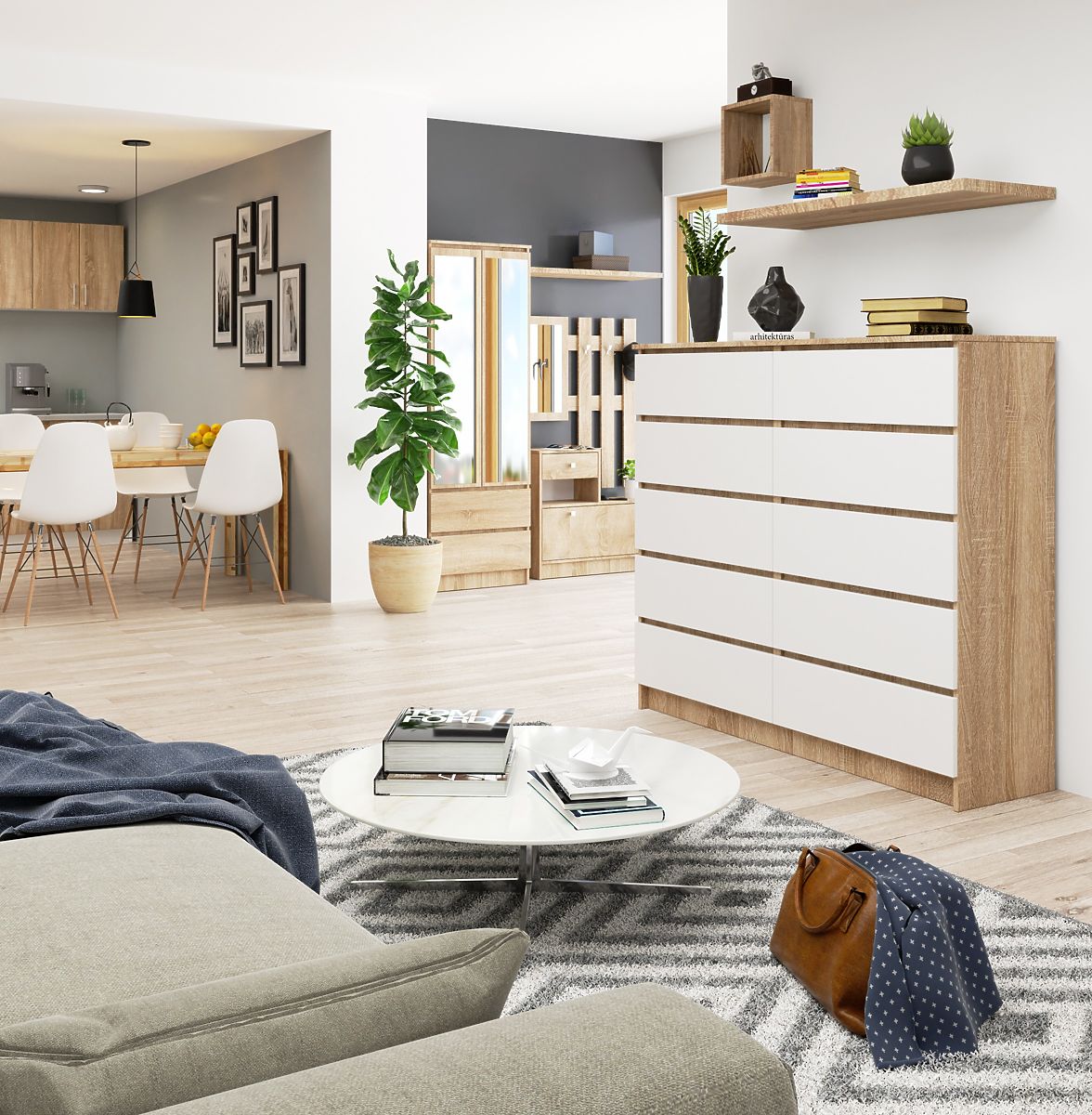 Commode en chêne sonoma et blanc avec 10 tiroirs spacieux. .. plus