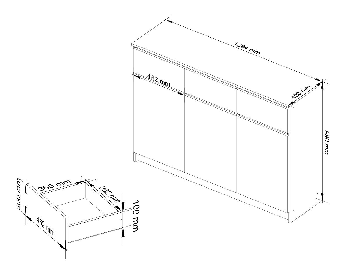La commode est un type de meuble à usage polyvalent. Elle permet de ranger en toute sécurité de nombreux articles de bureau ou documents divers. Le meuble que nous proposons vous surprendra agréablement par sa fonctionnalité et son prix attractif. Les dimensions de la commode sont de 138 cm x 99 cm x 40 cm. Le meuble est fabriqué en panneau stratifié de 16 millimètres d'épaisseur, résistant à l'usure. Les bords sont équipés d'un chant ABS.