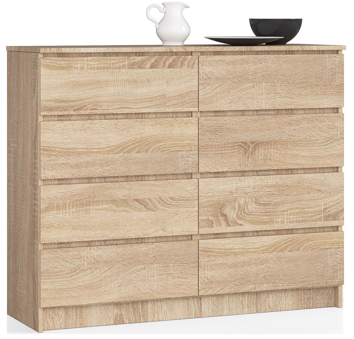 Le meuble présenté trouvera certainement sa place dans le salon, ainsi que dans la chambre, la salle à manger ou le bureau à domicile. La commode K140 équipée de huit tiroirs s'avère également être une solution pratique dans tout intérieur de bureau. Les caractéristiques distinctives de cette offre sont avant tout la couleur tendance chêne sonoma, la fonctionnalité et la fabrication solide. Le meuble fabriqué en panneau laminé d'une épaisseur de 16 millimètres, montrant une résistance à l'usure, plaira certainement aux personnes qui apprécient des espaces modernes et bien agencés. Une grande commode à un prix compétitif devrait répondre aux exigences de tous les clients qui apprécient un bon rapport qualité-prix des produits sélectionnés. Le meuble est facile à nettoyer et se combine parfaitement avec n'importe quel accessoire.