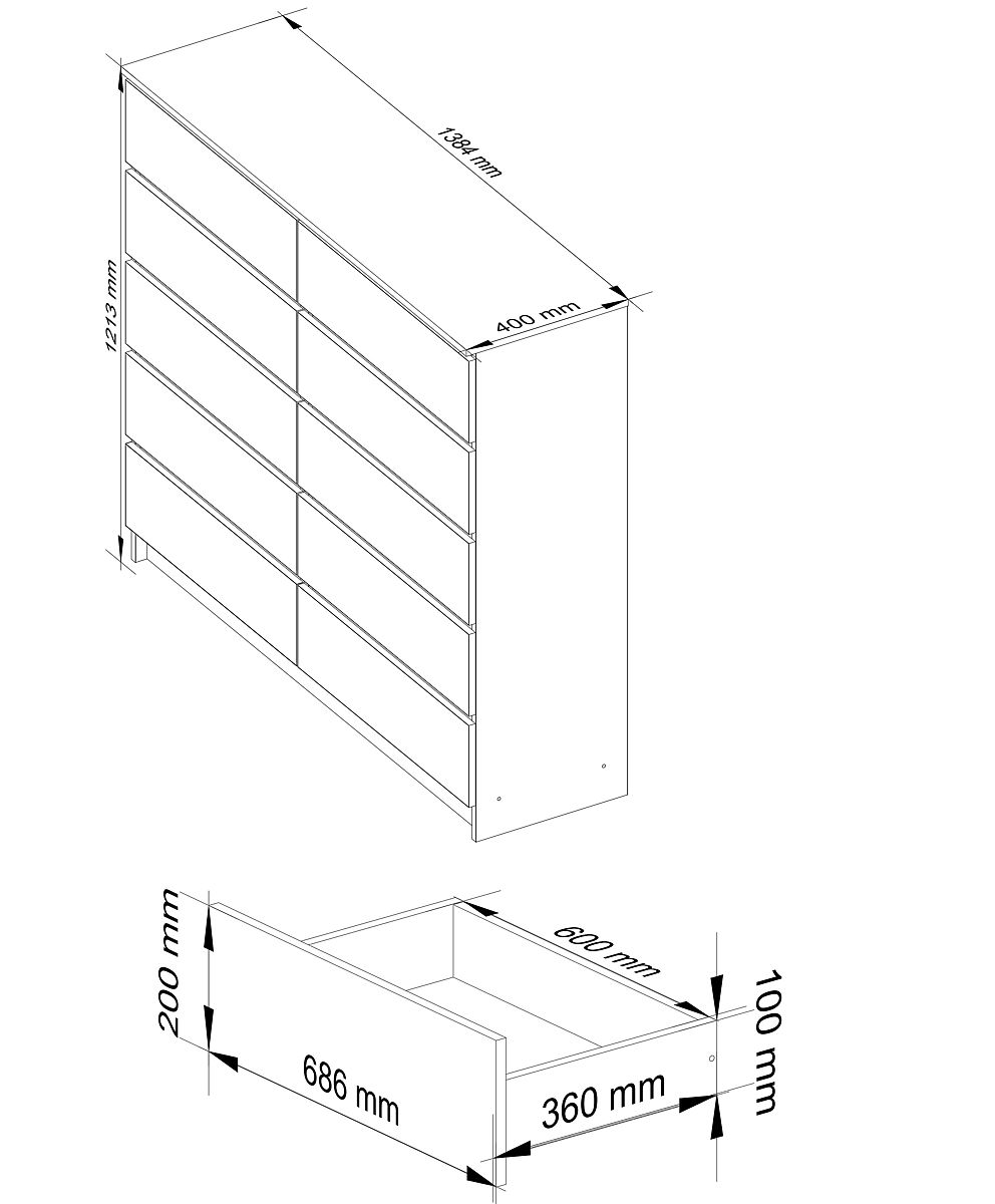 Commode blanche au style minimaliste, idéale pour les intérieurs modernes ainsi que pour les petits espaces nécessitant un éclairage et un agrandissement optique. Elle offre un espace de rangement pratique avec ses dix tiroirs spacieux, permettant de maintenir facilement l'ordre dans la maison. Parfaite pour le salon, le bureau ou un couloir étroit.