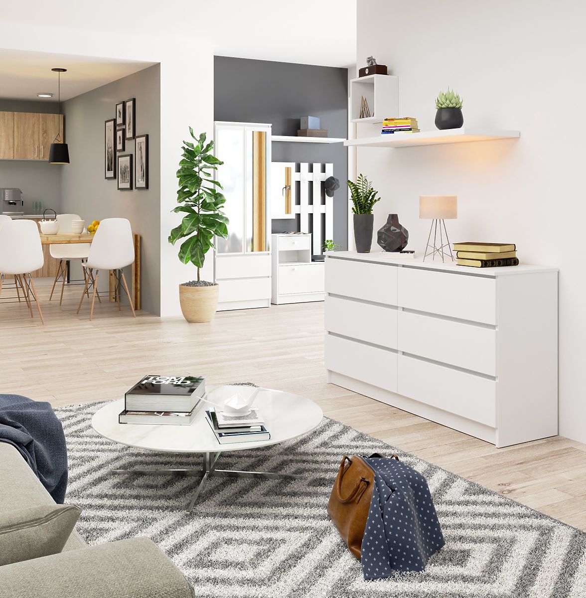 La COMMODE K140 6 TIROIRS est un meuble simple et minimaliste dans sa forme. Elle s'intègre parfaitement dans les pièces au design moderne et scandinave, où dominent les couleurs claires. Ce meuble blanc est parfait pour le salon, la chambre, l'entrée, mais aussi pour le bureau ou l'atelier. Sa hauteur est de 77 cm, sa longueur de 140 cm et sa profondeur de 40 cm.
