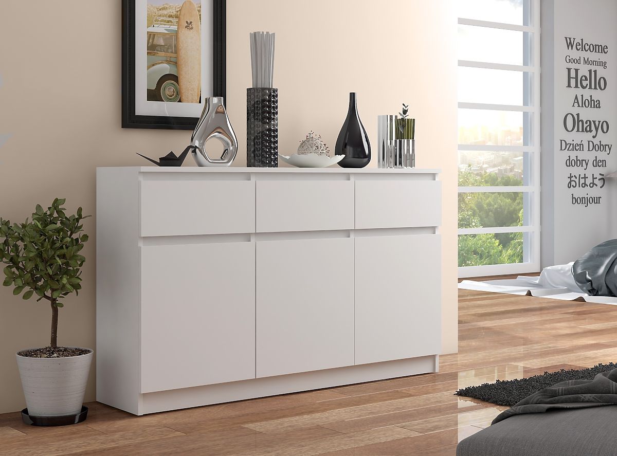 Nous vous présentons une commode extrêmement élégante, fabriquée en panneau laminé de haute qualité. Elle a une épaisseur de 16 mm et est résistante à l'usure. Elle provient du fabricant reconnu Kronospan, garantissant sa durabilité. La commode dispose de trois tiroirs et de trois armoires. Les tiroirs glissent sur des rails à billes métalliques, assurant une ouverture et une fermeture fluides et légères. Chaque armoire a une étagère spacieuse qui peut être ouverte à l'aide de portes. Les bords du meuble sont collés avec un chant ABS, offrant une haute protection contre les dommages.