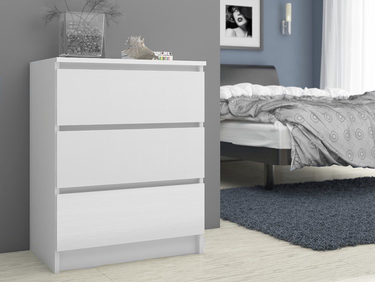 La beauté réside dans la simplicité, ce que nous comprenons bien, c'est pourquoi nous vous proposons le plus beau mobilier de chambre. L'une de nos propositions est une élégante commode blanche de 60 cm, qui ravira sûrement les amateurs de style scandinave. Le mobilier blanc est très populaire ces derniers temps - ce n'est pas surprenant : il combine utilité pratique, polyvalence et apparence attrayante. La commode blanche avec 3 tiroirs est une proposition qui convient parfaitement aux salons, chambres, chambres d'enfants et d'amis, salles à manger et bien d'autres pièces. Elle peut également être utilisée avec succès dans un bureau. Trois tiroirs pratiques peuvent facilement accueillir tous les objets nécessaires. La commode est fabriquée en panneau laminé de 16 mm, caractérisé par une résistance accrue à l'abrasion. Les bords sont plaqués avec un chant ABS. Nous vous recommandons de profiter de notre offre.