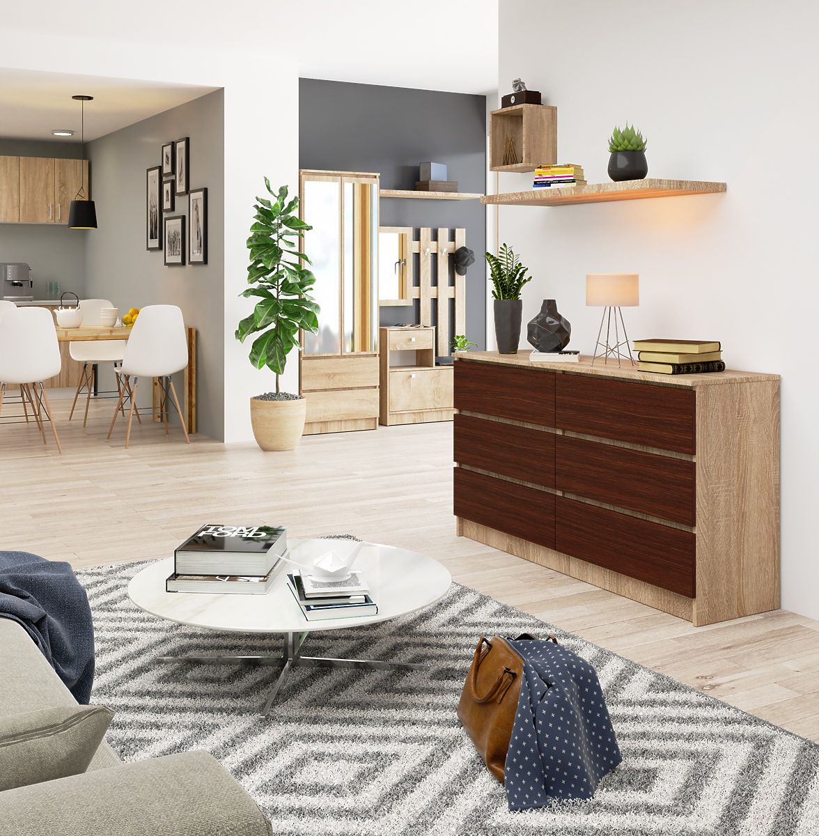 La large commode est une combinaison de deux nuances classiques et belles de bois, à savoir wenge et sonoma. Ces couleurs sont très populaires ces dernières années et il n'est pas surprenant qu'elles suscitent un grand intérêt parmi les clients de notre boutique en ligne. Si vous recherchez une commode fonctionnelle et de qualité, vous êtes au bon endroit. Le meuble est composé de six tiroirs fabriqués en panneau laminé résistant à l'usure et aux dommages.
