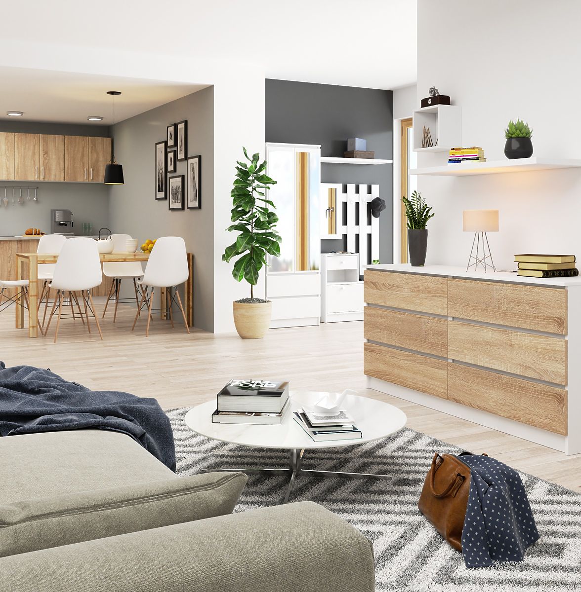 Optimisez l'espace de votre salon tout en le décorant esthétiquement avec notre commode de couleur blanc/sonoma. Elle est fabriquée en panneau laminé de haute qualité, résistant à l'usure. De plus, la commode est équipée de chants ABS pour assurer une protection contre les dommages.