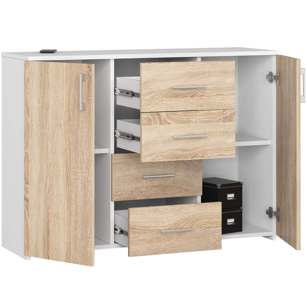 Commode en panneau laminé avec tiroirs et portes abattantes. .. plus