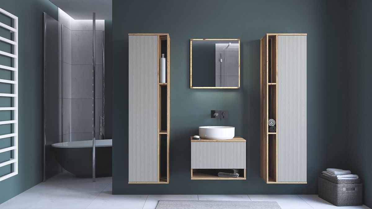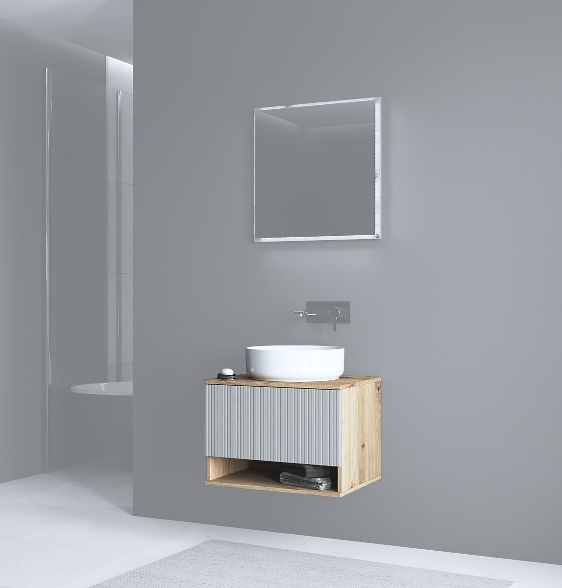 Meuble sous lavabo en chêne artisan avec façade cachemire mat. .. plus