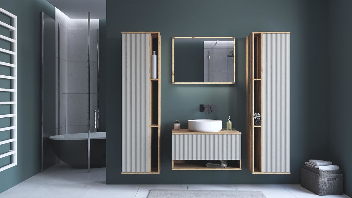 Meuble sous lavabo en chêne artisan avec façade cachemire mat. .. plus