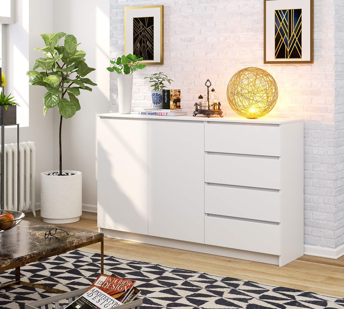 La commode blanche se distingue également par sa grande valeur pratique. Elle possède 4 tiroirs facilement ouvrables et 2 très grandes étagères. Une telle construction assure un confort de rangement et est une solution très fonctionnelle. Dans la commode, vous pouvez ranger tous les objets nécessaires et les avoir toujours à portée de main.