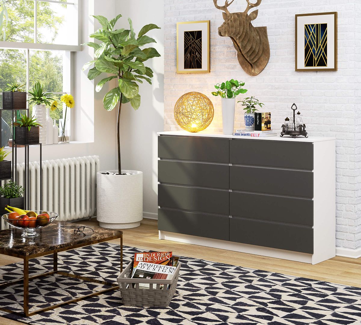 Commode avec 8 tiroirs en blanc et gris graphite. .. plus