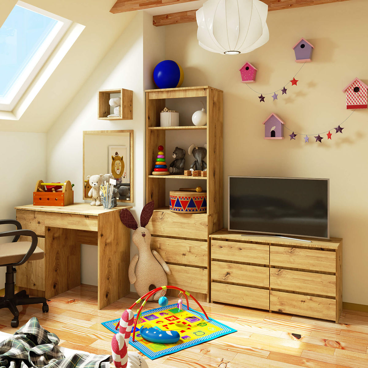 Dans l'industrie du meuble, une attention particulière est accordée à la fonctionnalité des produits et à leur haute valeur esthétique. La commode CL 100 cm en est un excellent exemple. Ce meuble pratique est fabriqué en panneau laminé résistant à l'usure, garantissant sa durabilité et sa résistance. Les six tiroirs spacieux peuvent accueillir divers livres, documents ou petits objets. Certains de nos clients choisissent de l'utiliser pour ranger des vêtements ou des sous-vêtements. La commode en chêne artisan a un design élégant. Sa forme simple et son exécution élégante conviennent aussi bien aux intérieurs classiques et élégants qu'à ceux romantiques. Ce meuble exceptionnel s'intègre parfaitement dans un salon stylé ou une chambre confortable. Il est également utilisé comme partie intégrante d'une garde-robe ou d'une entrée. La commode avec 6 tiroirs est appréciée tant par les clients individuels que par les entrepreneurs. Grâce à son apparence impeccable et à sa capacité extraordinaire, elle est idéale comme élément de mobilier de bureau.