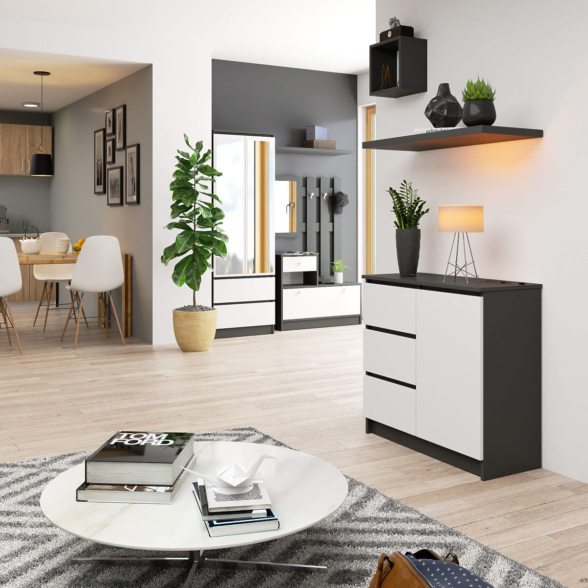 Petite commode moderne avec 1 porte et 3 tiroirs en gris graphite et blanc. .. plus