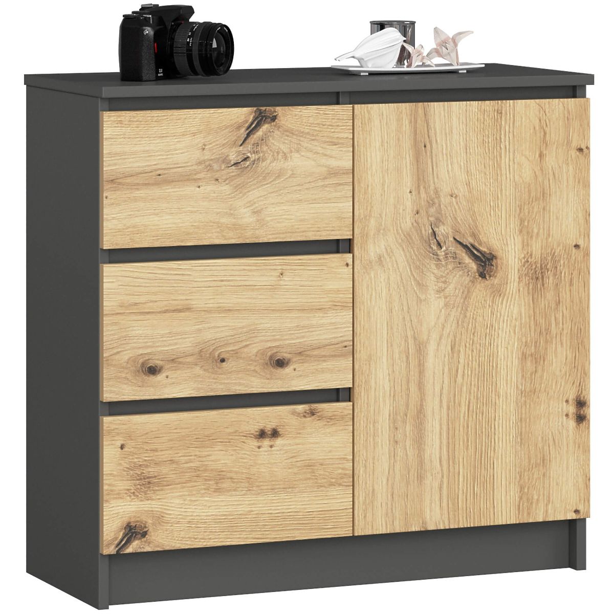Commode moderne en gris graphite et chêne artisan avec 3 tiroirs et 1 porte. .. plus
