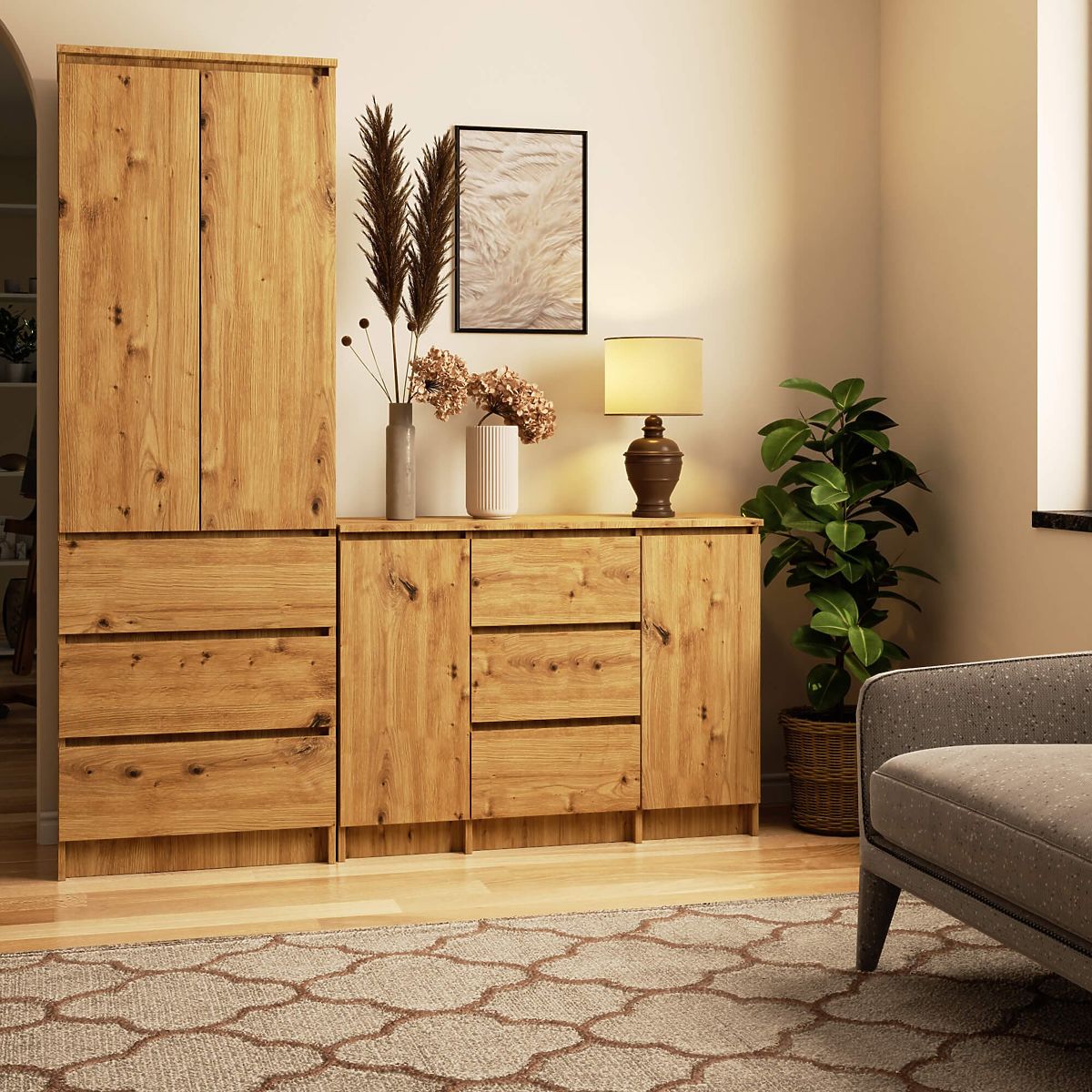 Commode en chêne Artisan avec 3 tiroirs et 2 portes. .. plus