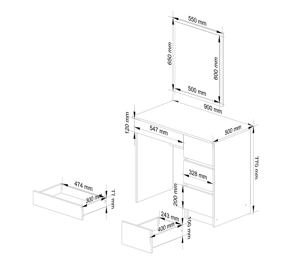 La coiffeuse est composée de la table A-6 et d'un tiroir supplémentaire avec un panneau miroir.