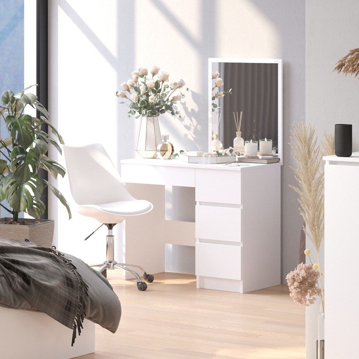 Coiffeuse blanche avec miroir pour un maquillage facile. .. plus