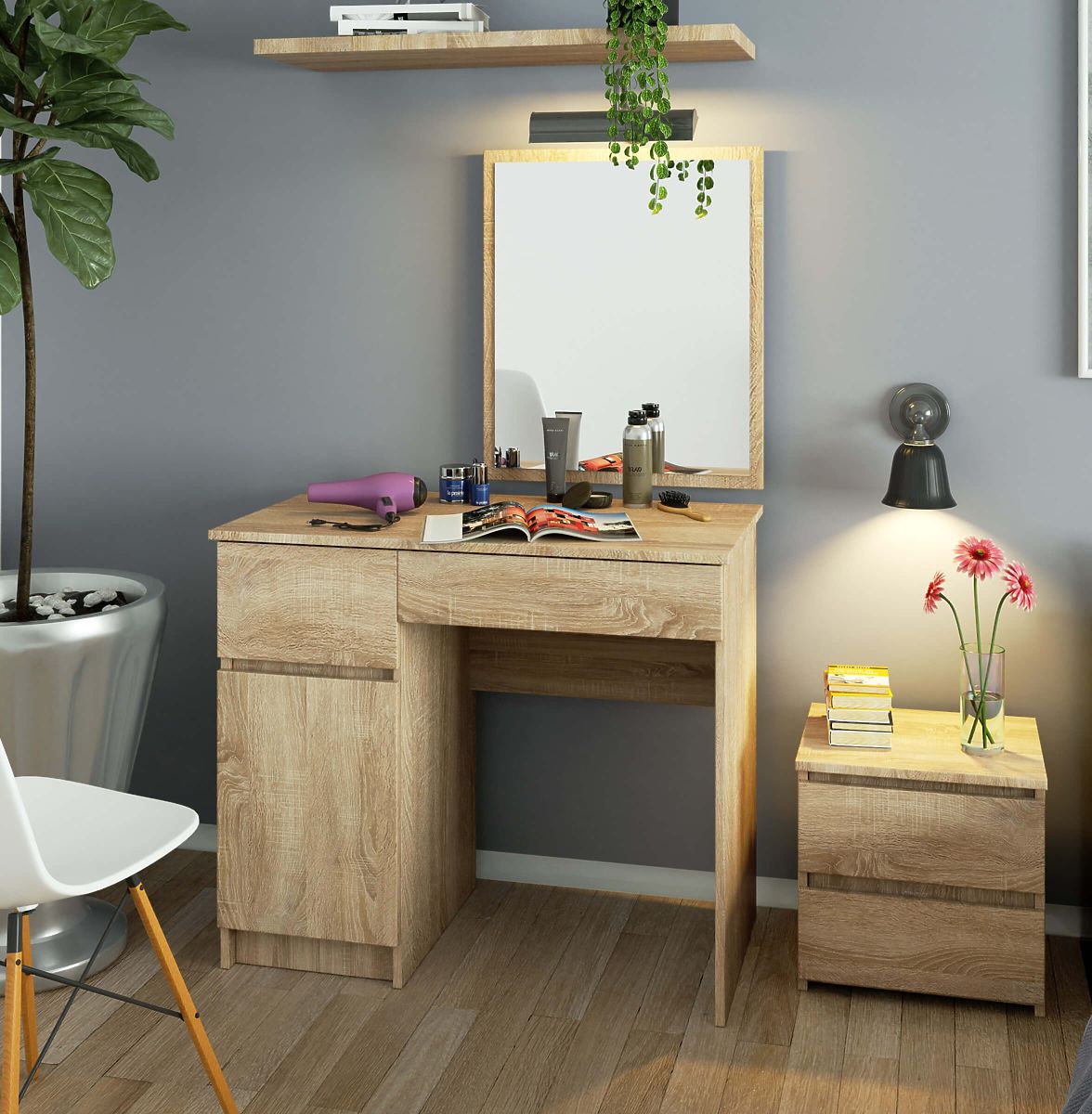 Coiffeuse avec miroir en couleur chêne sonoma avec tiroirs et espace spacieux derrière les portes. Configuration sur le côté gauche.