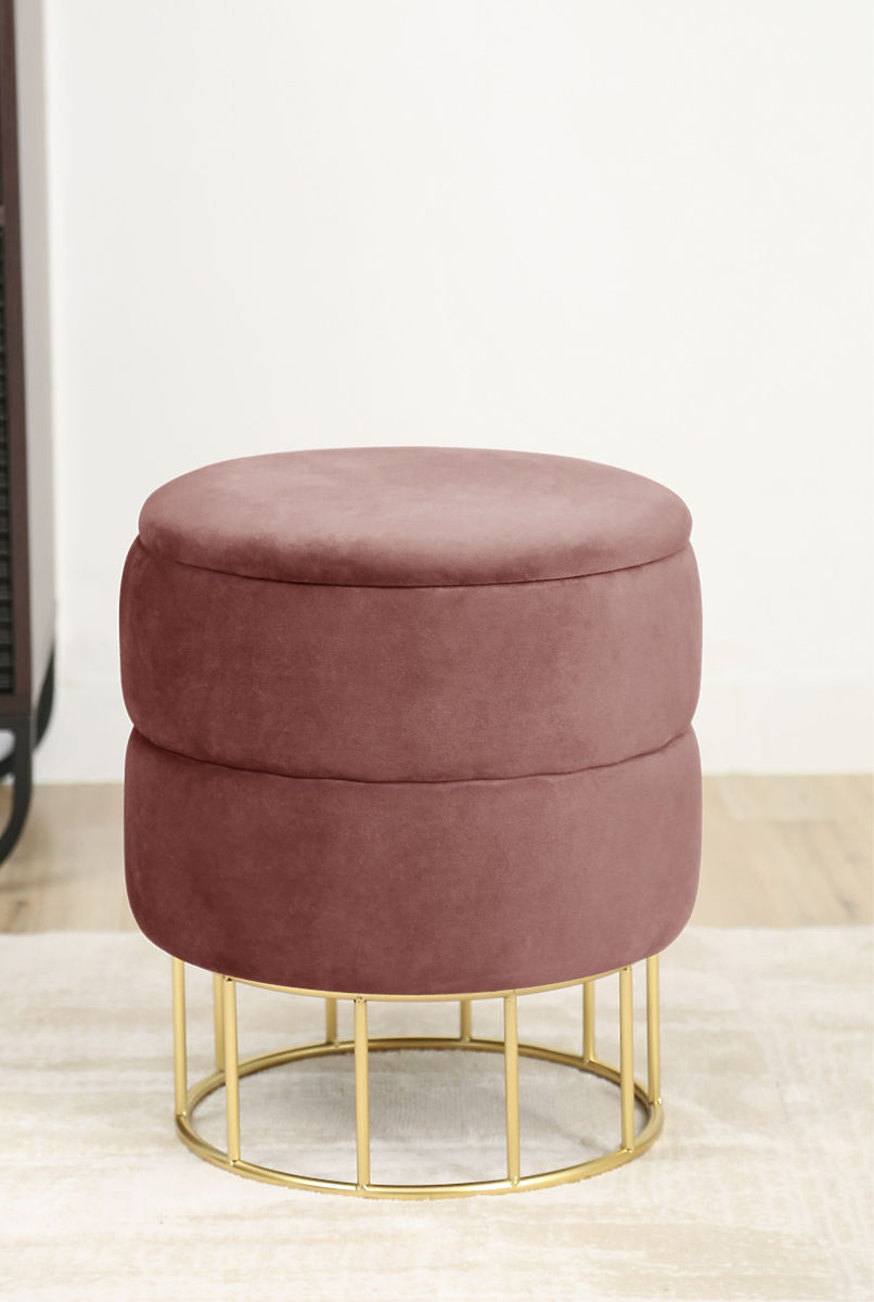 Pouf rose poudré avec rangement et base dorée. .. plus