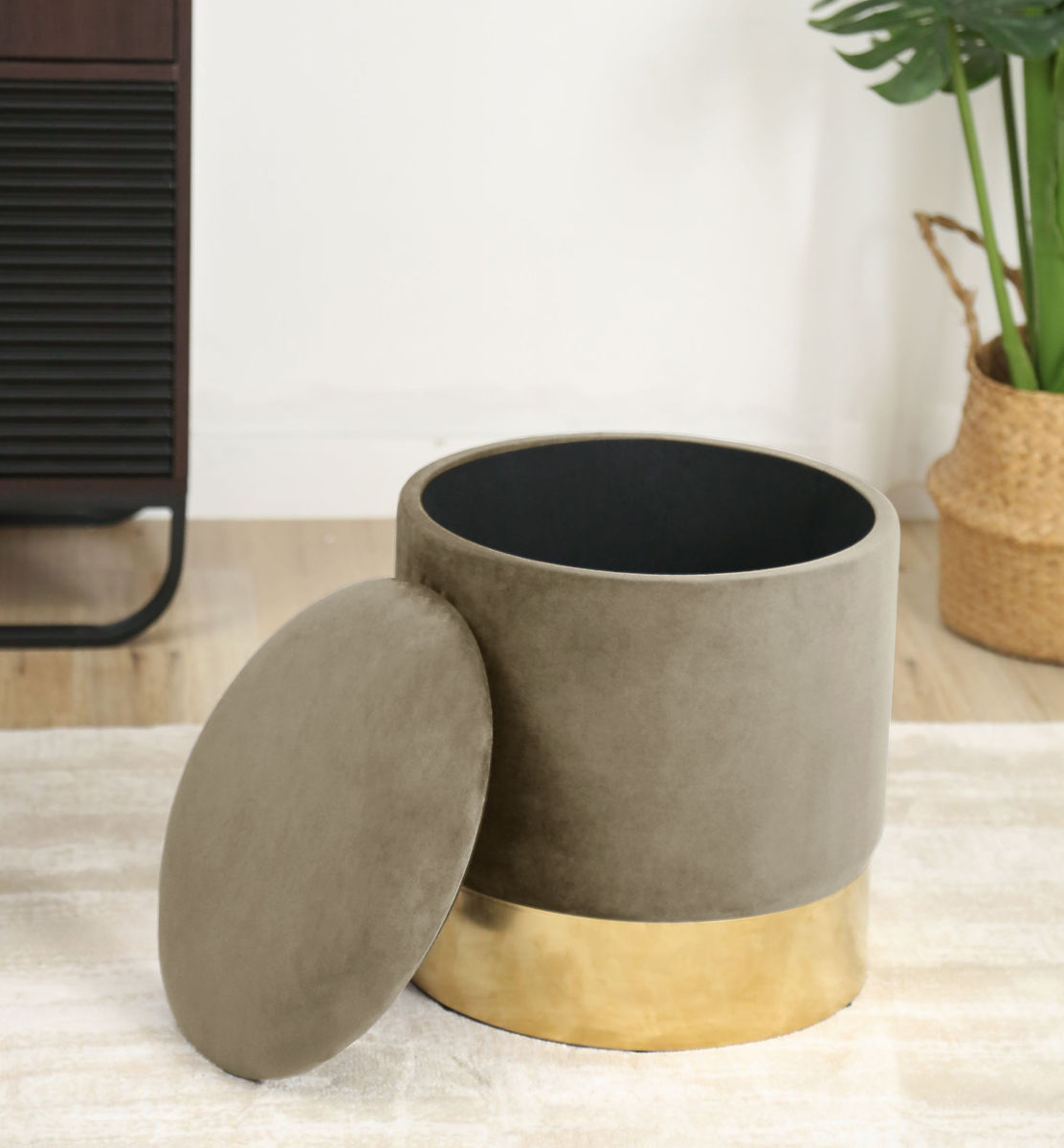 Pouf avec espace de rangement sur une base métallique de couleur dorée.