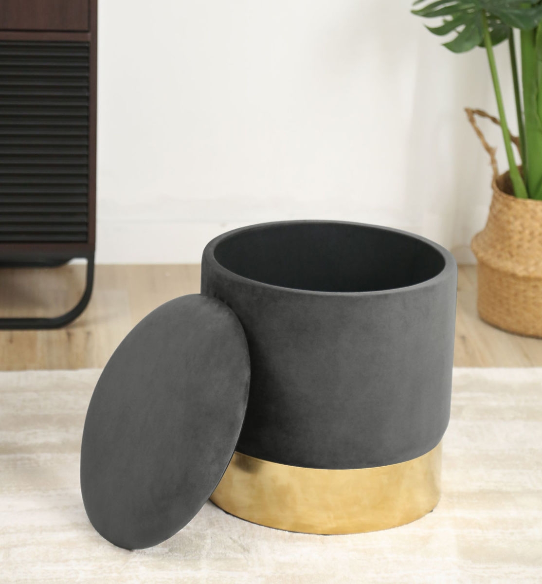 Pouf rond en velours gris avec rangement et pieds dorés. .. plus