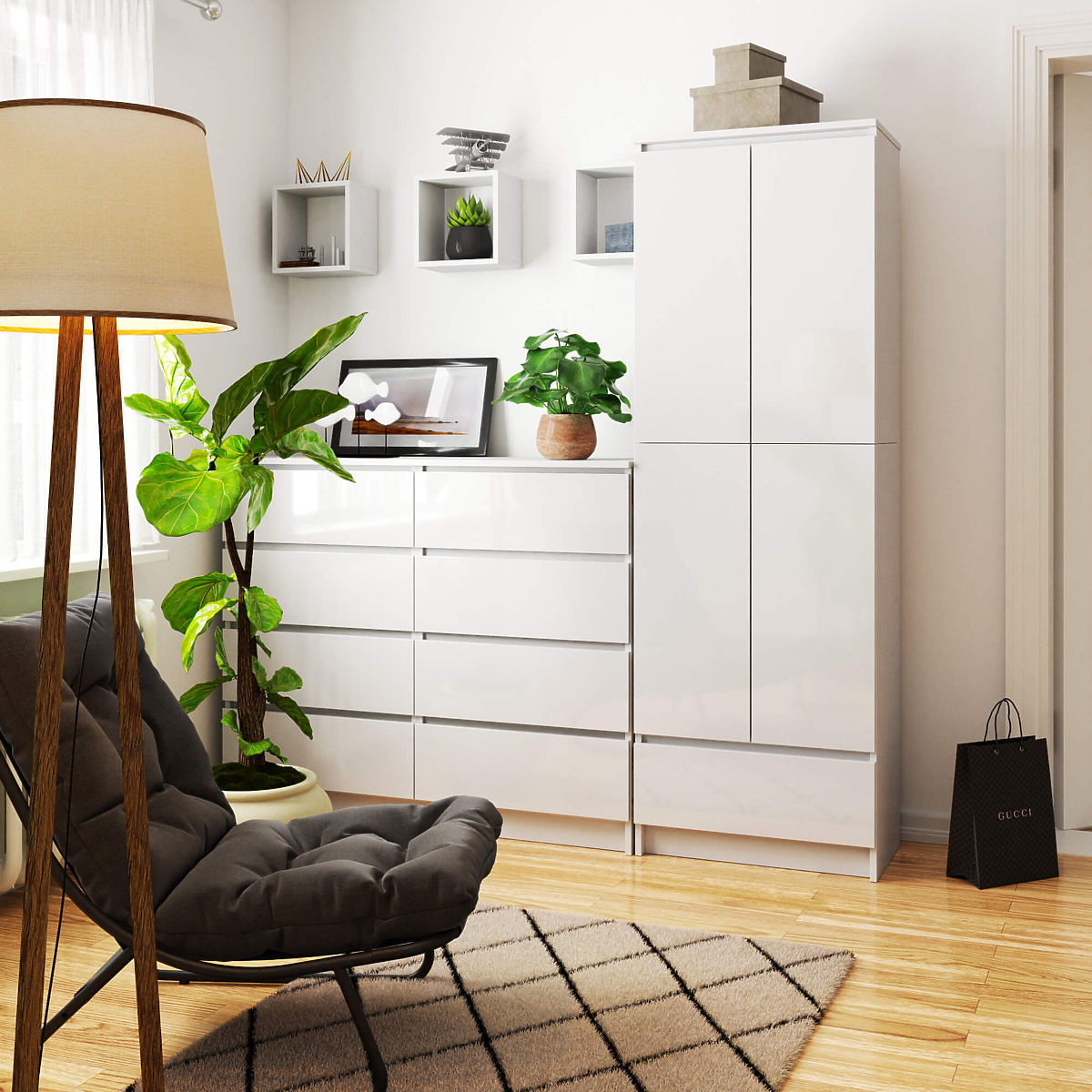 La bibliothèque blanche de bureau avec tiroir est une combinaison parfaite de fonctionnalité et d'attrait visuel. Le meuble est pratique et facile à maintenir en parfait état de propreté, tout en étant très esthétique. La partie fermée contient des étagères spacieuses, tandis que la partie inférieure dispose d'un tiroir spacieux et facile à tirer. L'utilisation de la bibliothèque est très polyvalente et dépend des besoins individuels. Elle peut contenir des livres, des classeurs de documents et des fournitures de bureau, ou être utilisée pour la vaisselle, les nappes ou les serviettes. La couleur blanche classique et la forme simple de la bibliothèque garantissent qu'elle s'adapte à tout intérieur, quelle que soit la couleur des murs ou le style de décoration. Le meuble est fabriqué en matériau durable, un panneau laminé résistant à l'usure et aux dommages. Les bords de l'armoire sont recouverts d'un chant ABS durable et esthétique. Les façades de la bibliothèque sont laquées avec un brillant élevé, ajoutant une élégance supplémentaire au meuble. Les portes supérieures et inférieures sont reliées en un seul ensemble et ne s'ouvrent pas séparément.