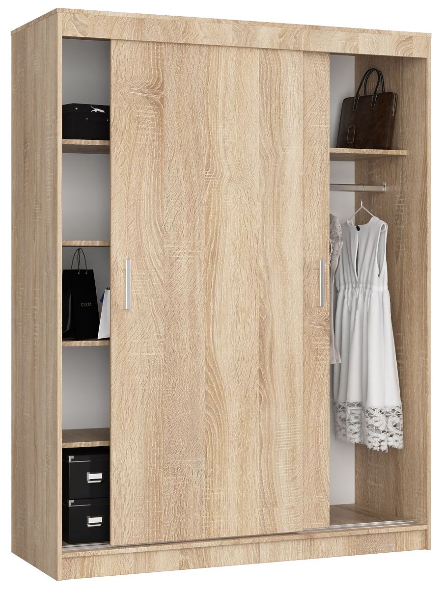 Lors de l'achat d'une armoire, nous nous assurons qu'elle soit pratique et qu'elle puisse contenir un maximum de nos vêtements et accessoires. Notre armoire coulissante CLP de 200 cm de hauteur et 150 cm de largeur répond certainement à ces critères ! Grâce à ses 6 étagères profondes et sa tringle, vous pourrez facilement ranger non seulement des t-shirts ordinaires, mais aussi des robes élégantes, des costumes ou des vestes. Qu'est-ce qui distingue encore notre armoire ? Sa finition en couleur chêne sonoma s'intègre idéalement dans des intérieurs simples, minimalistes et scandinaves. Elle s'accordera également bien avec des murs blancs.