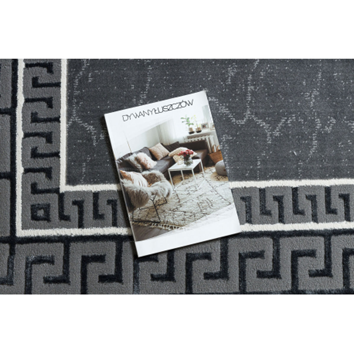 Tapis gris ALLURE 1960 avec motif clé grecque et cadre décoratif. .. plus