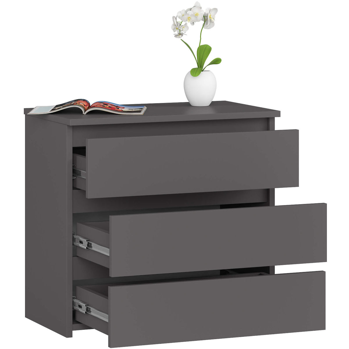 La commode gris graphite a 3 tiroirs qui s'ouvrent facilement. Elle convient parfaitement à la chambre à coucher comme élément indispensable de son équipement. Les tiroirs peuvent contenir du linge, des accessoires cosmétiques ou un ensemble de literie de rechange. Le plateau est idéal pour placer une lampe de chevet et poser une lecture intéressante. Le meuble peut également être placé dans la chambre d'enfant et d'adolescent.