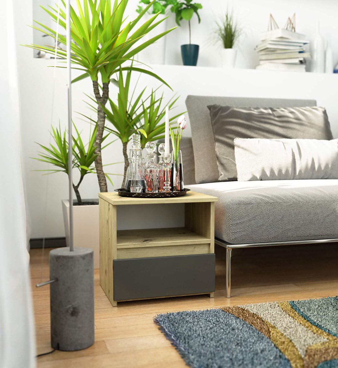 Les tables de chevet sont un type de mobilier populaire placé à côté du lit. Sur son plateau se trouve le plus souvent une lampe, tandis qu'à l'intérieur se trouvent des objets facilitant le repos et le sommeil. Les personnes à la recherche d'une commode élégante devraient prêter attention à la table de chevet CL1 40 cm en couleur chêne artisan gris graphite. Elle s'intégrera parfaitement dans toute chambre à coucher. Elle peut également être placée dans une chambre d'enfant.