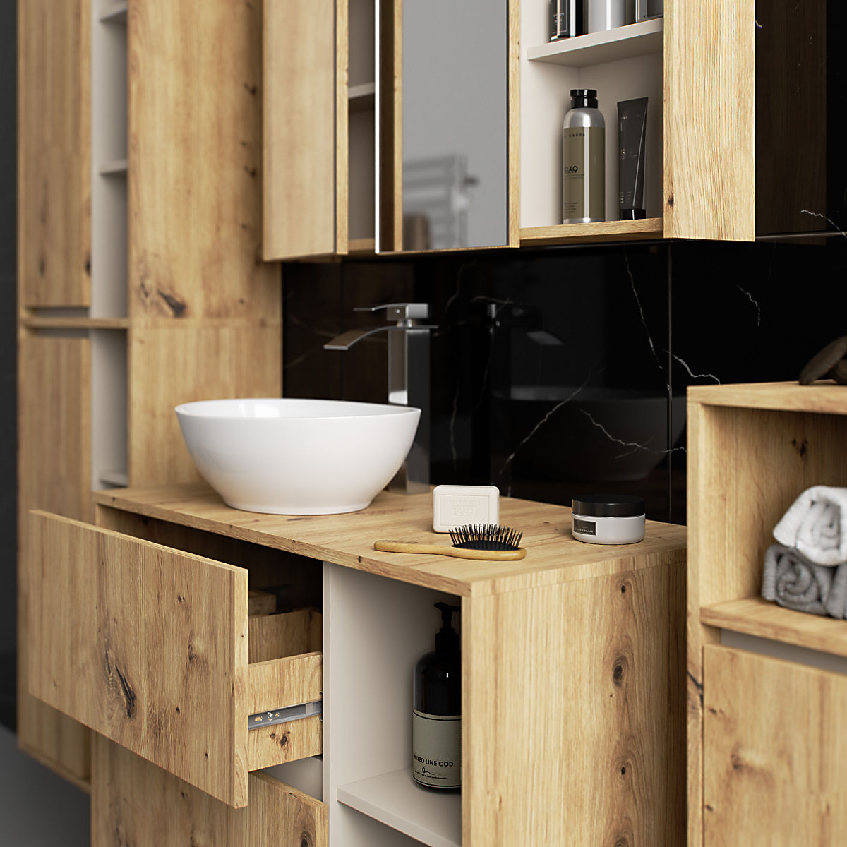 Les armoires de salle de bain complètent parfaitement l'équipement de la salle de bain, offrant l'espace nécessaire pour tous les cosmétiques et détergents et ajoutant un certain style à la salle de bain. Les armoires spacieuses facilitent le maintien de l'ordre dans la pièce, ce qui influence positivement l'esthétique de l'intérieur. La collection VAMI se distingue par une palette de couleurs stylée et attrayante - le corps et les façades ont la même couleur, tandis que la couleur intérieure est différente.