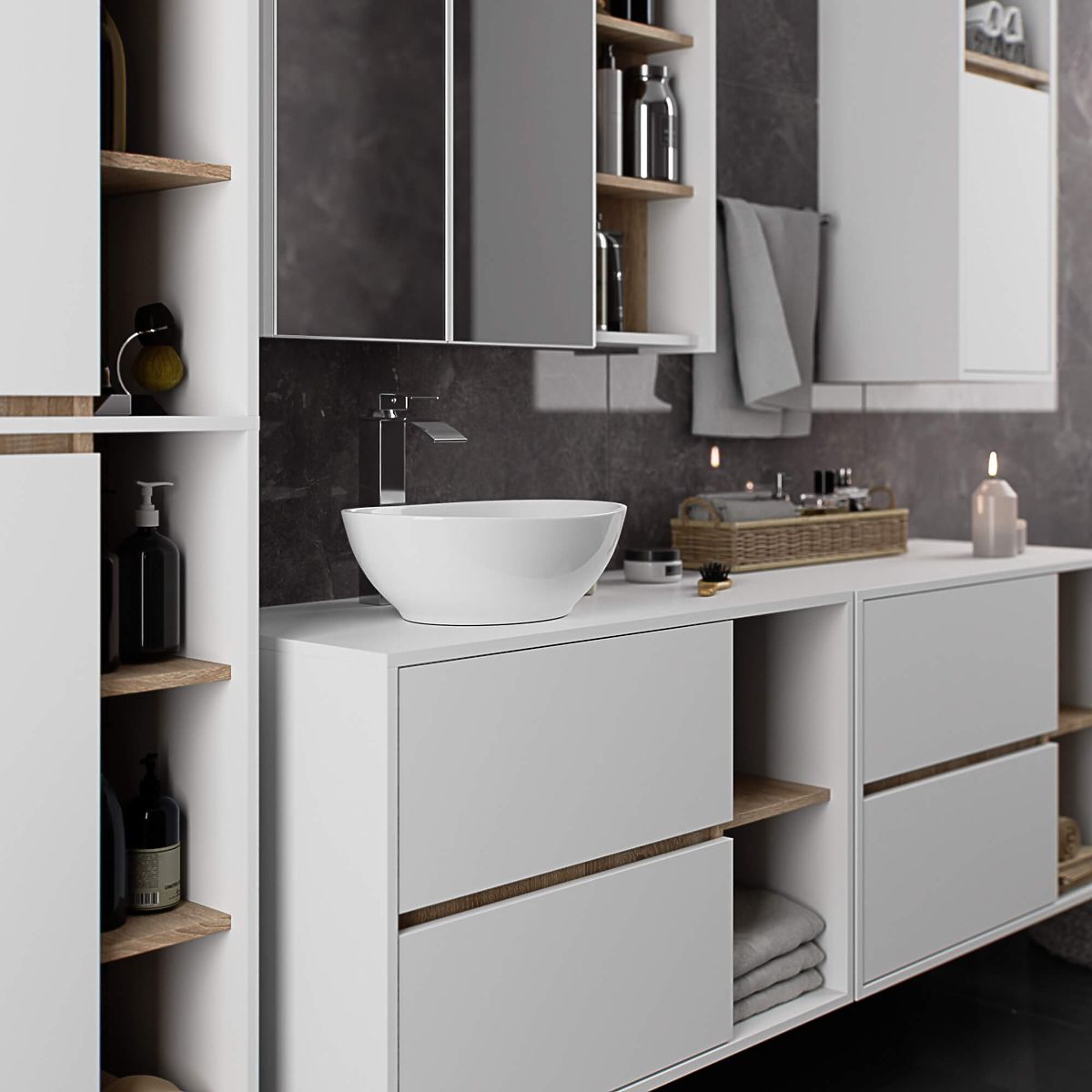 Les armoires de salle de bain complètent parfaitement l'équipement de la salle de bain, offrant l'espace nécessaire pour tous les cosmétiques et détergents et donnant à la salle de bain un style défini. Les armoires spacieuses facilitent le maintien de l'ordre dans la pièce, ce qui améliore l'esthétique de l'intérieur. La collection VAMI se distingue par une palette de couleurs élégante et accrocheuse - le corps et les façades ont la même couleur, tandis que la couleur intérieure est différente.