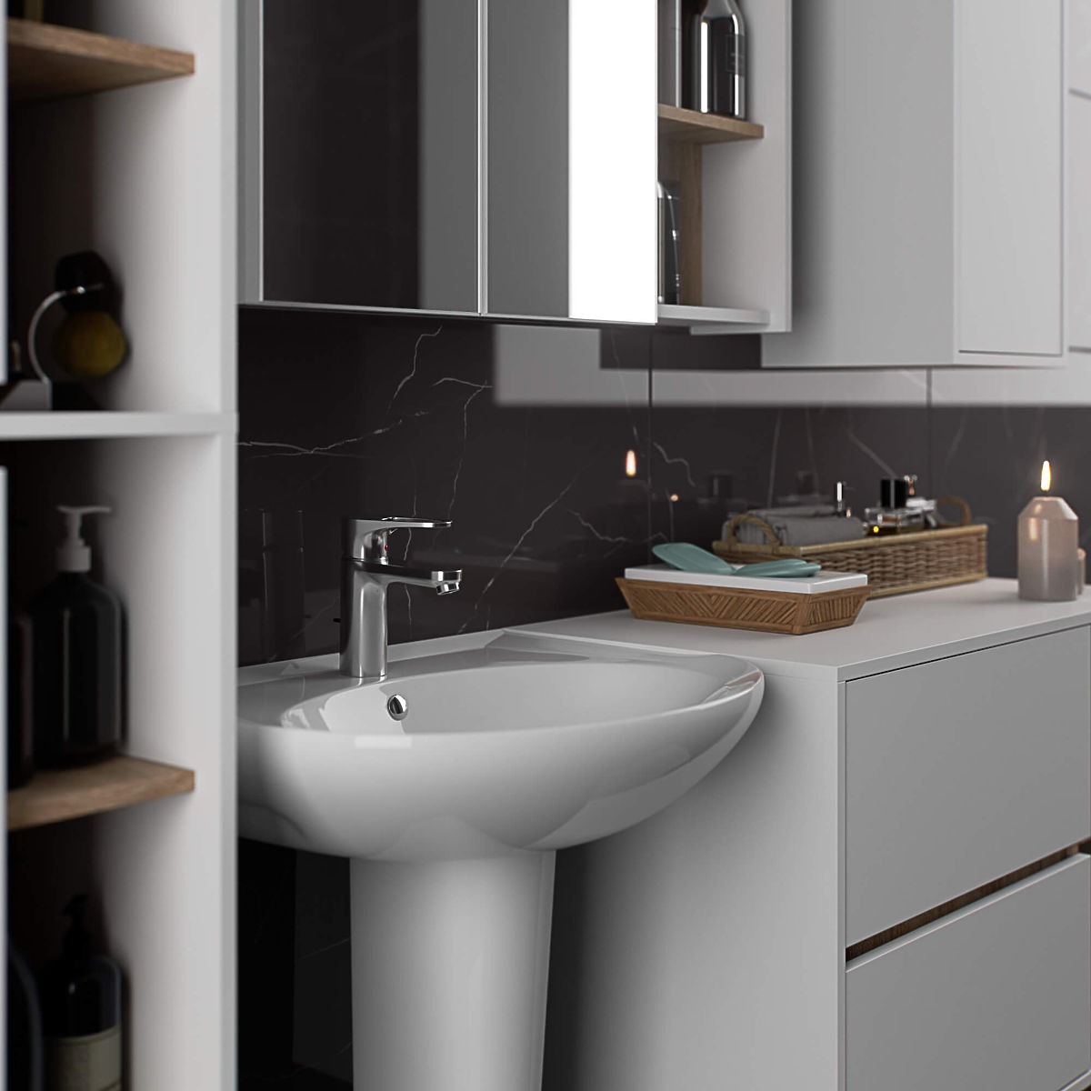Les meubles de salle de bain complètent parfaitement l'équipement de la salle de bain, offrant l'espace nécessaire pour tous les cosmétiques et détergents, et conférant à la salle de bain un style défini. Les meubles spacieux facilitent le maintien de l'ordre dans la pièce, ce qui améliore l'esthétique de l'intérieur. La collection VAMI se distingue par une palette de couleurs élégante et accrocheuse - le corps et les façades ont la même couleur, tandis que la couleur intérieure est différente.