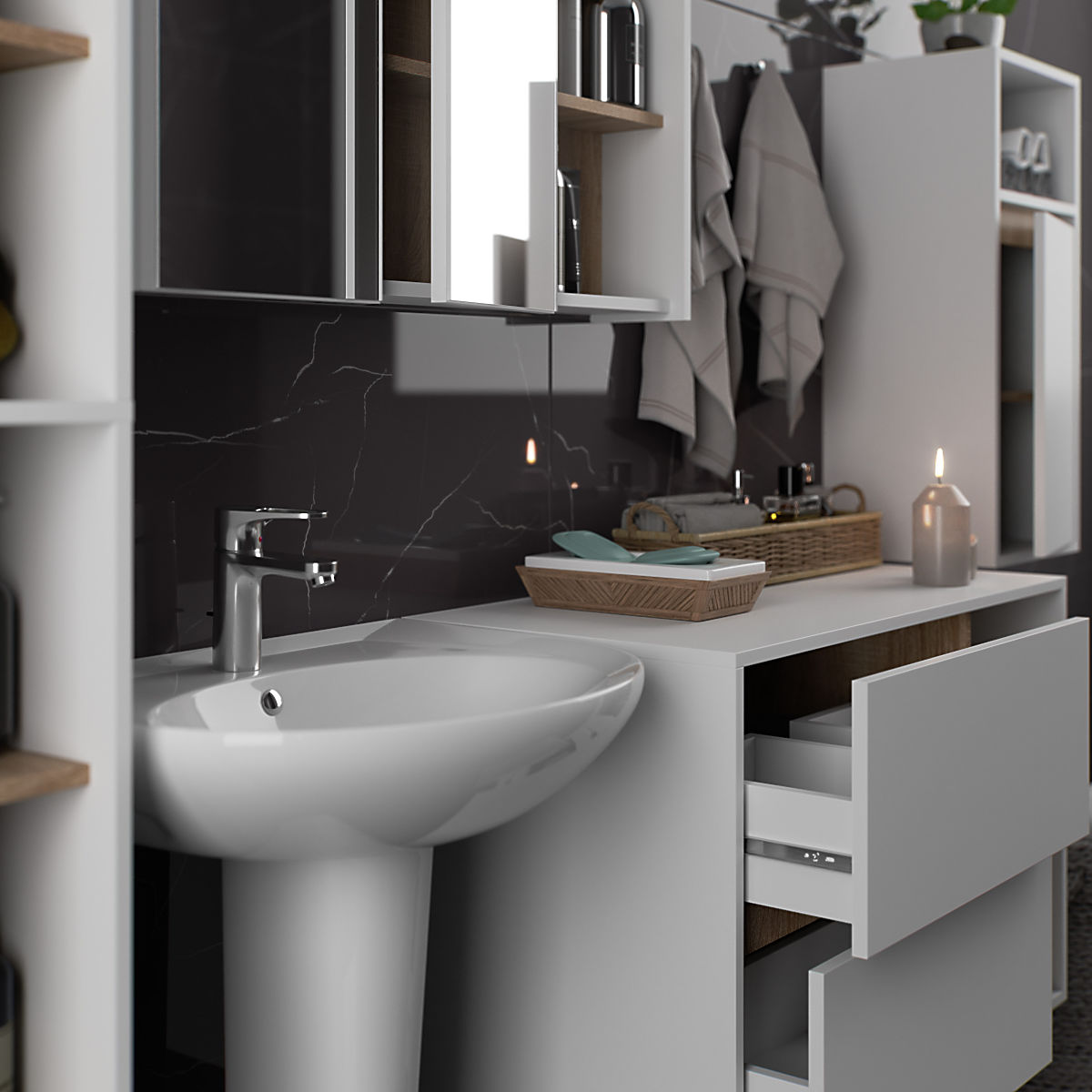 L'ensemble de meubles de salle de bain VAMI est l'essence même du style moderne. Grâce aux étagères ouvertes, les armoires paraissent visuellement légères et s'intègrent parfaitement aux dernières tendances du design. Les meubles de salle de bain VAMI offrent également suffisamment d'espace fermé pour ranger les produits de nettoyage, les accessoires de salle de bain et les cosmétiques. L'ensemble comprend une armoire suspendue sous lavabo avec plateau, 2 tiroirs et 2 étagères ouvertes (W90), une armoire suspendue avec 1 étagère ouverte W35, une haute armoire suspendue W50 avec 6 étagères ouvertes et une armoire suspendue avec miroir et 3 étagères ouvertes W90. L'ensemble est uniformément coloré et stylisé, garantissant une apparence harmonieuse. L'armoire sous lavabo a des tiroirs façonnés permettant l'installation de siphon et d'éléments hydrauliques. L'ensemble comprend :