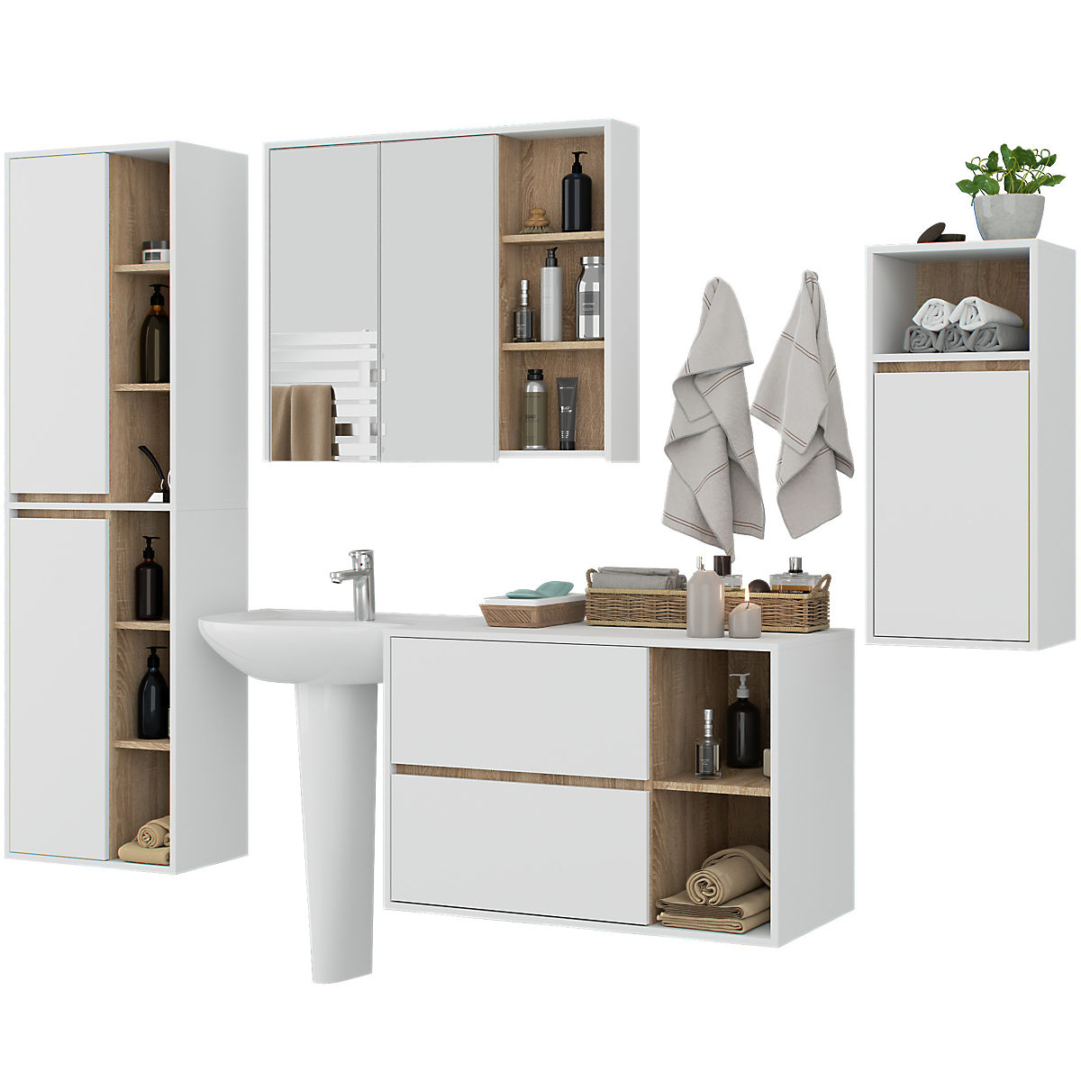 Les armoires sont indépendantes, elles peuvent donc être placées dans n'importe quelle configuration et à n'importe quel espacement selon vos besoins. Le prix ne concerne que les armoires de salle de bain, les éléments décoratifs ne sont pas inclus dans l'ensemble.