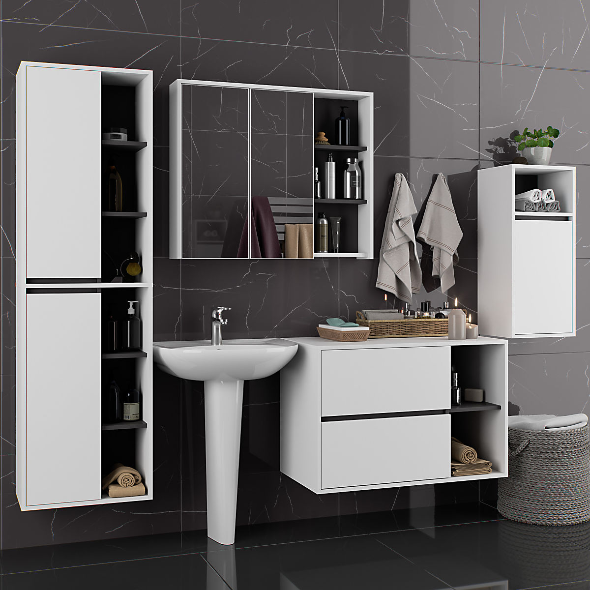 Les armoires sont indépendantes, ce qui permet de les disposer dans n'importe quelle configuration et espacement selon vos besoins. Le prix ne concerne que les armoires de salle de bain, les éléments décoratifs ne sont pas inclus dans l'ensemble.