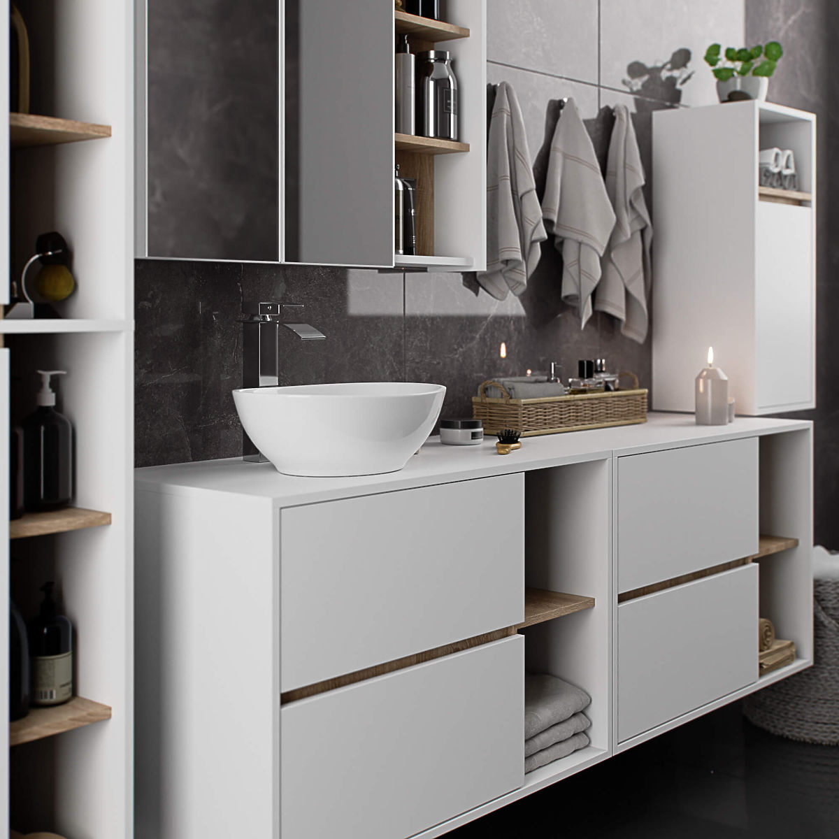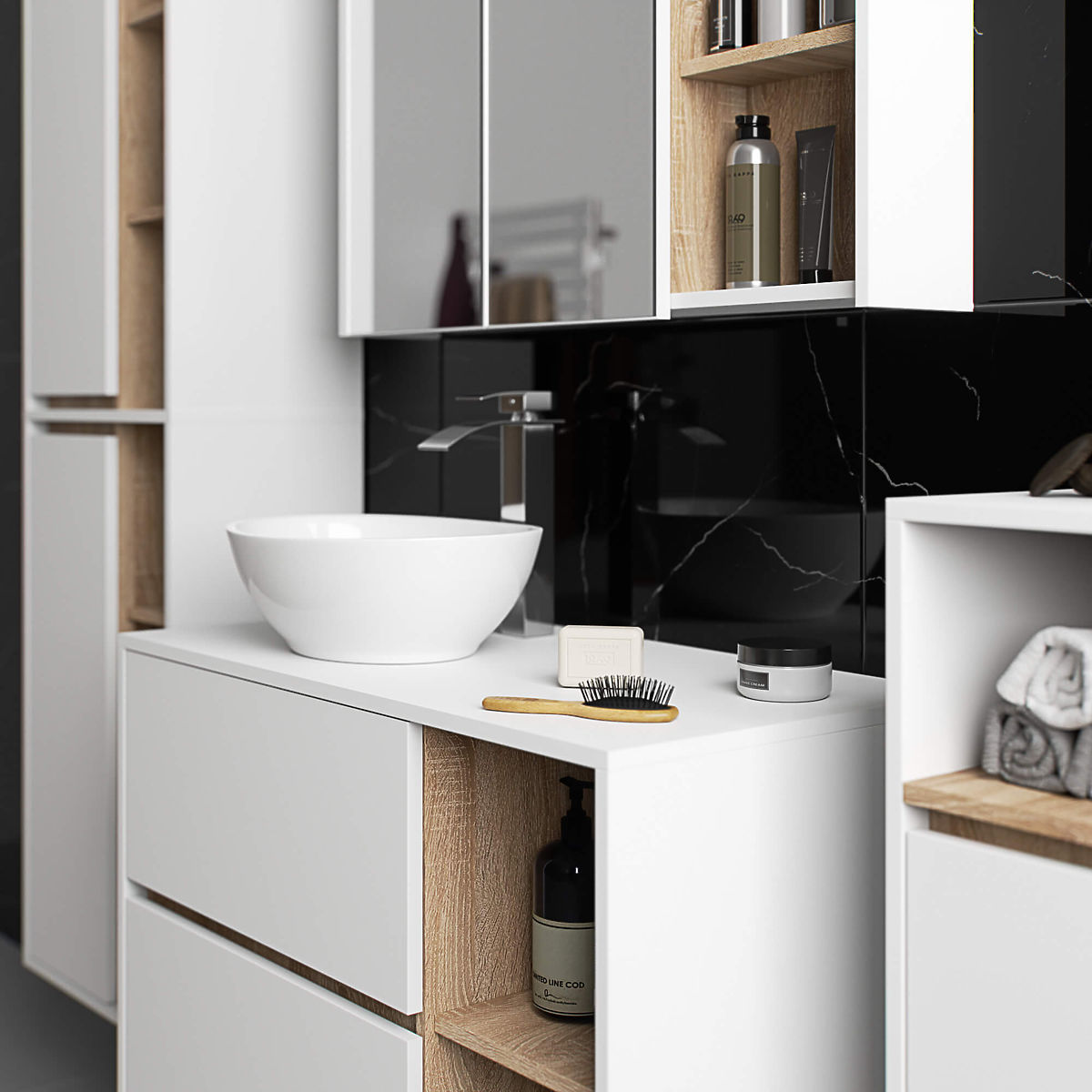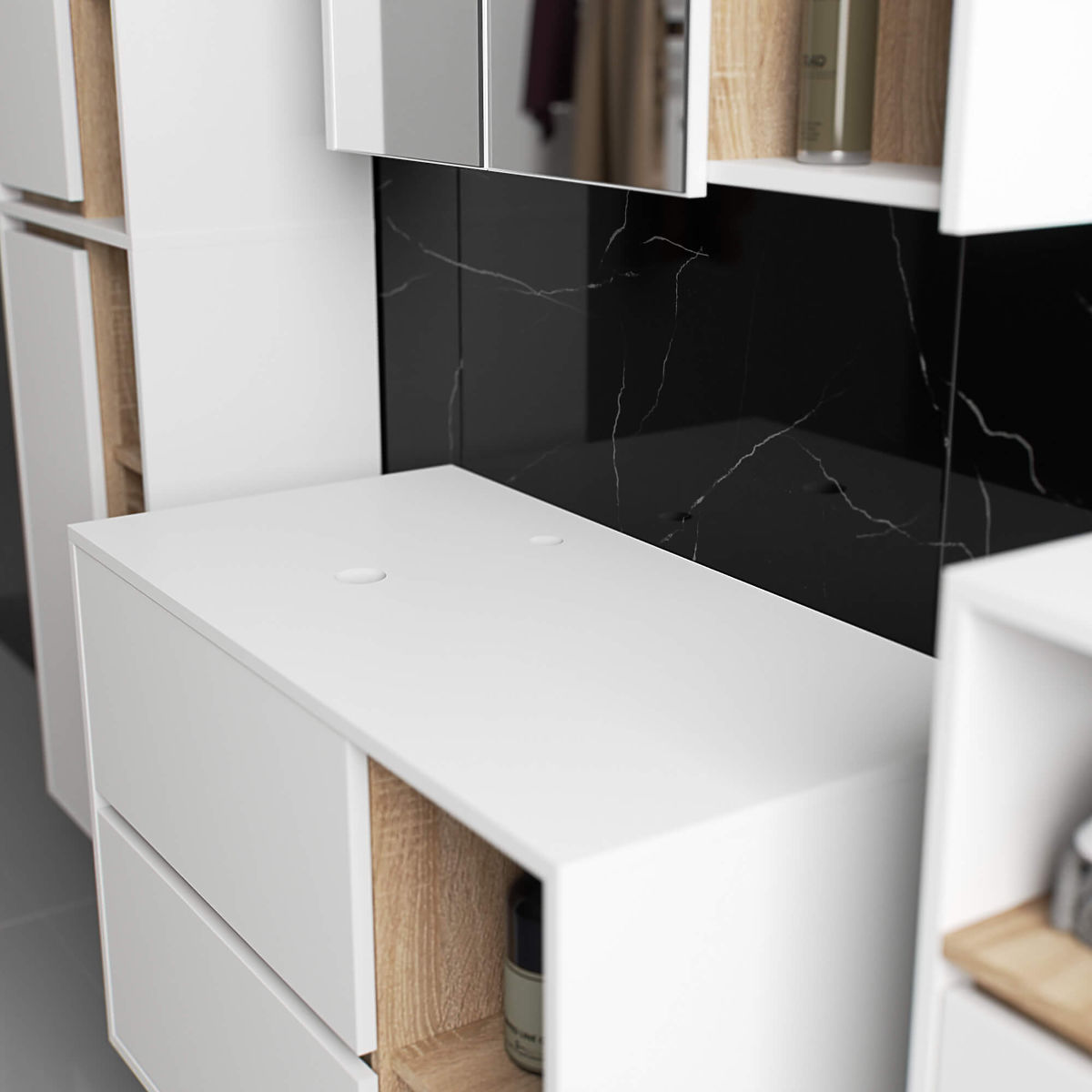 Armoire suspendue de salle de bain sous lavabo 90 cm VAMI W90 s'intègre parfaitement dans un intérieur moderne. La configuration avec 2 tiroirs et 2 étagères ouvertes offre un grand confort d'utilisation. Les tiroirs spacieux peuvent accueillir des produits d'hygiène et de cosmétique, tandis que sur les étagères ouvertes, vous pouvez placer par exemple des décorations qui donneront un caractère plus personnel à l'intérieur. Ce modèle d'armoire suspendue sous lavabo a 2 trous dans le panneau pour l'installation du lavabo et du siphon. L'armoire dispose également de tiroirs spécialement conçus pour permettre l'installation du siphon et des éléments hydrauliques. ATTENTION ! Le meuble est livré sans lavabo ni robinetterie.