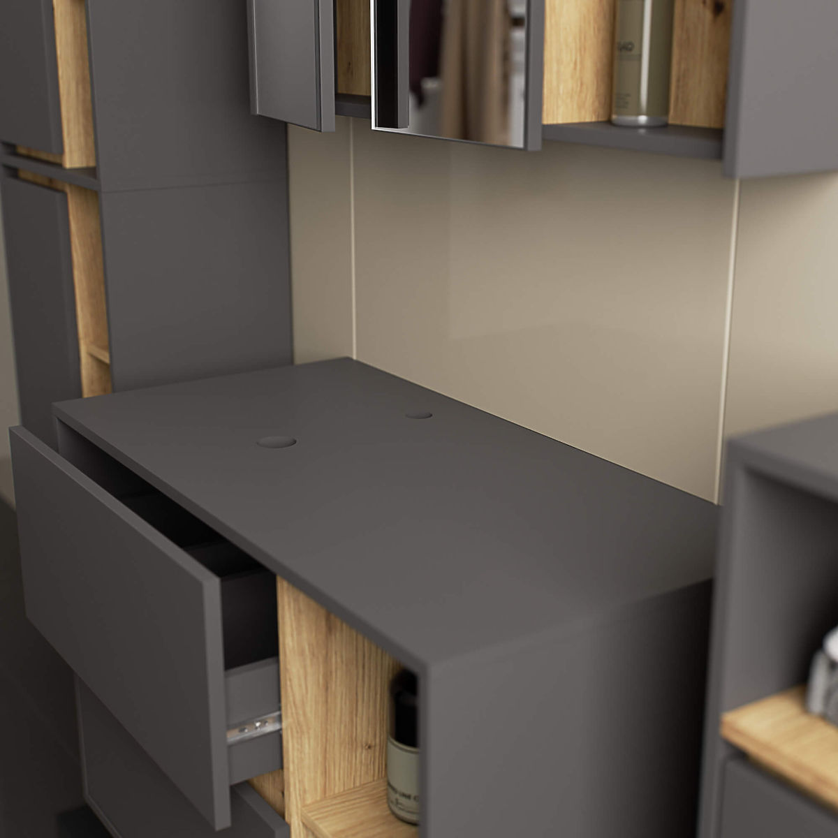 Armoire suspendue de salle de bain sous lavabo 90 cm VAMI W90 s'accorde parfaitement avec un intérieur moderne. La configuration avec 2 tiroirs et 2 étagères ouvertes offre un grand confort d'utilisation. Les tiroirs spacieux peuvent contenir des produits d'hygiène et de beauté, et les étagères ouvertes peuvent accueillir par exemple des décorations qui donneront un caractère unique à l'intérieur. Le modèle d'armoire suspendue sous lavabo décrit possède 2 trous dans le panneau destinés à l'installation du lavabo et du siphon. L'armoire dispose également de tiroirs spécialement conçus pour permettre l'installation du siphon et des éléments hydrauliques. ATTENTION ! Le meuble est livré sans lavabo et robinetterie.